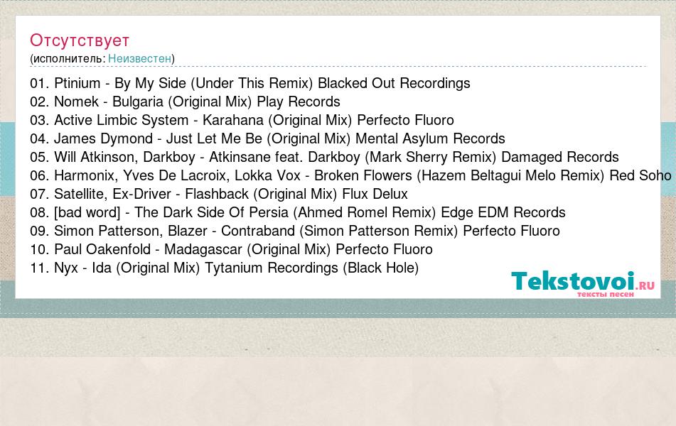 01. Ptinium - By My Side (Under This Remix) Blacked Out Recordings 02. Nomek - Bulgaria (Original Mix) Play Records 03. Active Limbic System - Karahana (Original Mix) Perfecto Fluoro 04. James Dymond - Just Let Me Be (Original Mix) Mental Asylum Records 05. Will Atkinson, Darkboy - Atkinsane feat. Darkboy (Mark Sherry Remix) Damaged Records 06. Harmonix, Yves De Lacroix, Lokka Vox - Broken Flowers (Hazem Beltagui Melo Remix) Red Soho 07. Satellite, Ex-Driver - Flashback (Original Mix) Flux Delux 08. Harmonic Rush - The Dark Side Of Persia (Ahmed Romel Remix) Edge EDM Records 09. Simon Patterson, Blazer - Contraband (Simon Patterson Remix) Perfecto Fluoro 10. Paul Oakenfold - Madagascar (Original Mix) Perfecto Fluoro 11. Nyx - Ida (Original Mix) Tytanium Recordings (Black Hole)