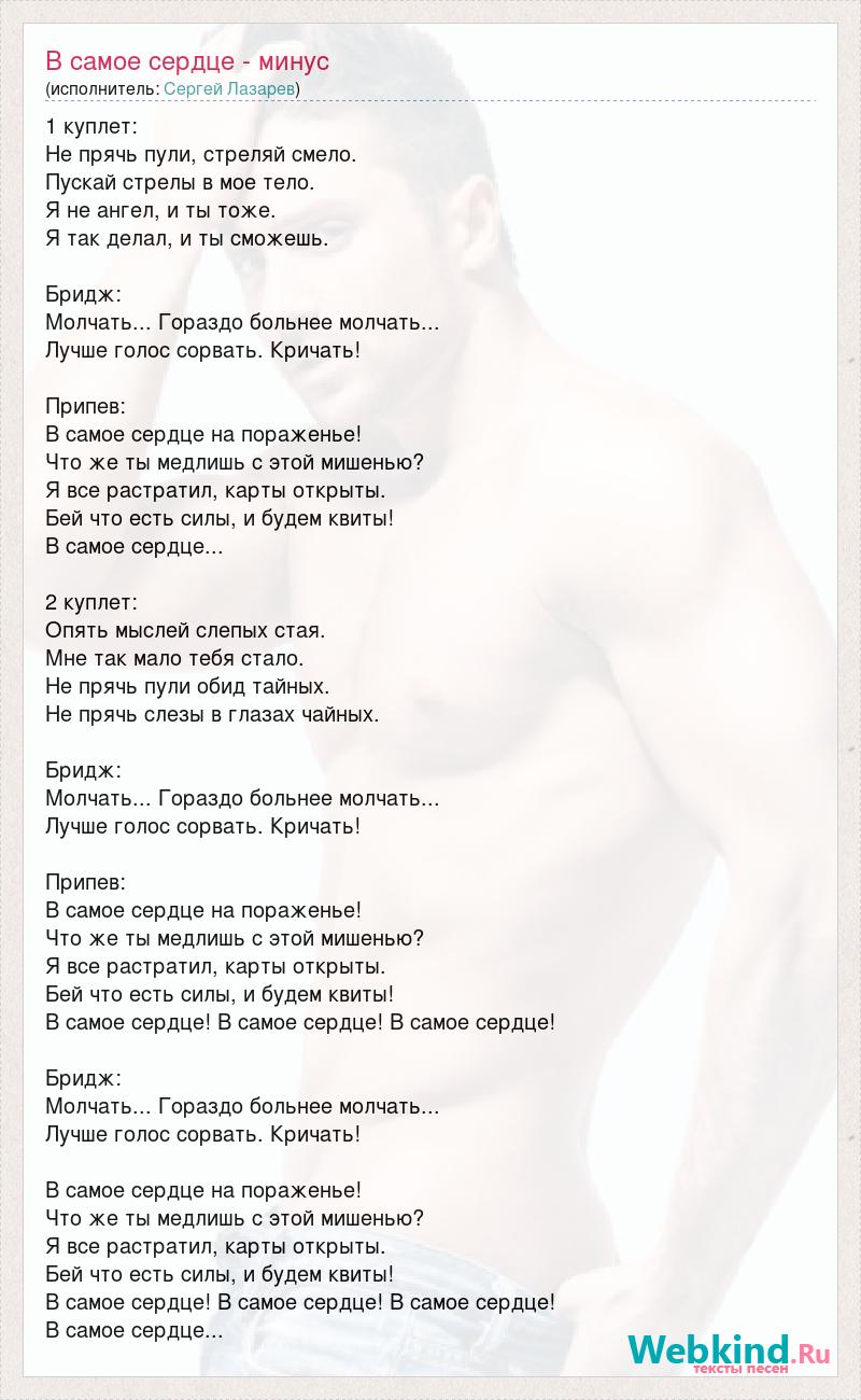 1 куплет: Не прячь пули, стреляй смело. Пускай стрелы в мое тело. Я не ангел, и ты тоже. Я так делал, и ты сможешь. Бридж: Молчать... Гораздо больнее молчать... Лучше голос сорвать. Кричать! Припев: В самое сердце на пораженье! Что же ты медлишь с этой мишенью? Я все растратил, карты открыты. Бей что есть силы, и будем квиты! В самое сердце... 2 куплет: Опять мыслей слепых стая. Мне так мало тебя стало. Не прячь пули обид тайных. Не прячь слезы в глазах чайных. Бридж: Молчать... Гораздо больнее молчать... Лучше голос сорвать. Кричать! Припев: В самое сердце на пораженье! Что же ты медлишь с этой мишенью? Я все растратил, карты открыты. Бей что есть силы, и будем квиты! В самое сердце! В самое сердце! В самое сердце! Бридж: Молчать... Гораздо больнее молчать... Лучше голос сорвать. Кричать! В самое сердце на пораженье! Что же ты медлишь с этой мишенью? Я все растратил, карты открыты. Бей что есть силы, и будем квиты! В самое сердце! В самое сердце! В самое сердце! В самое сердце...