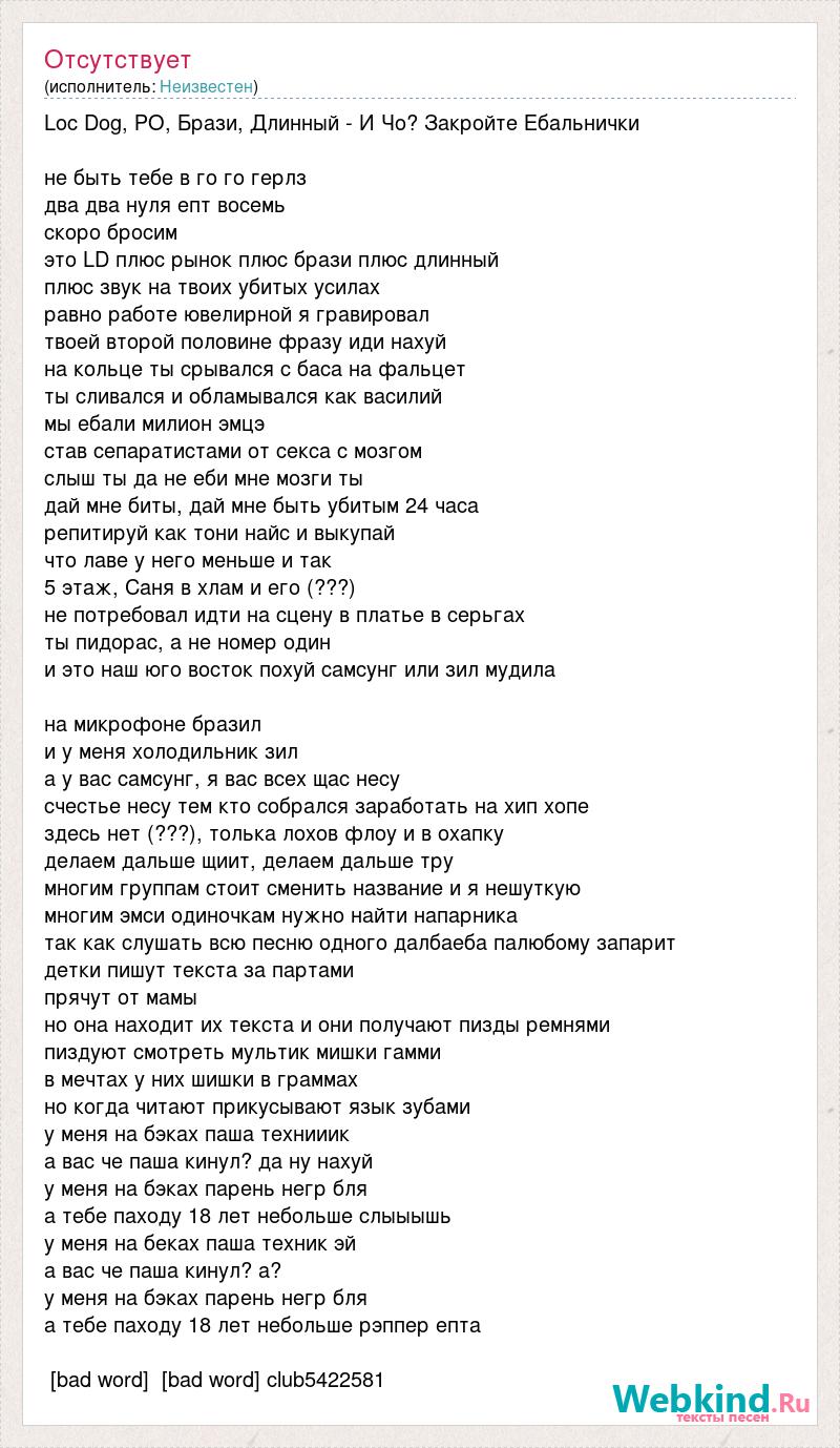 Loc Dog, РО, Брази, Длинный - И Чо? Закройте Ебальнички не быть тебе в го го герлз два два нуля епт восемь скоро бросим это LD плюс рынок плюс брази плюс длинный плюс звук на твоих убитых усилах равно работе ювелирной я гравировал твоей второй половине фразу иди нахуй на кольце ты срывался с баса на фальцет ты сливался и обламывался как василий мы ебали милион эмцэ став сепаратистами от секса с мозгом слыш ты да не еби мне мозги ты дай мне биты, дай мне быть убитым 24 часа репитируй как тони найс и выкупай что лаве у него меньше и так 5 этаж, Саня в хлам и его (???) не потребовал идти на сцену в платье в серьгах ты пидорас, а не номер один и это наш юго восток похуй самсунг или зил мудила на микрофоне бразил и у меня холодильник зил а у вас самсунг, я вас всех щас несу счестье несу тем кто собрался заработать на хип хопе здесь нет (???), толька лохов флоу и в охапку делаем дальше щиит, делаем дальше тру многим группам стоит сменить название и я нешуткую многим эмси одиночкам нужно найти напарника так как слушать всю песню одного далбаеба палюбому запарит детки пишут текста за партами прячут от мамы но она находит их текста и они получают пизды ремнями пиздуют смотреть мультик мишки гамми в мечтах у них шишки в граммах но когда читают прикусывают язык зубами у меня на бэках паша технииик а вас че паша кинул? да ну нахуй у меня на бэках парень негр бля а тебе паходу 18 лет небольше слыыышь у меня на беках паша техник эй а вас че паша кинул? а? у меня на бэках парень негр бля а тебе паходу 18 лет небольше рэппер епта [bad word] [bad word] club5422581
