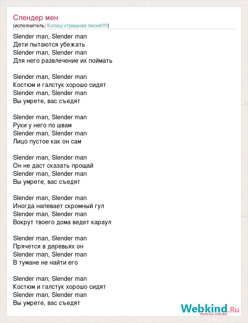 Slender man, Slender man Дети пытаются убежать Slender man, Slender man Для него развлечение их поймать Slender man, Slender man Костюм и галстук хорошо сидят Slender man, Slender man Вы умрете, вас съедят Slender man, Slender man Руки у него по швам Slender man, Slender man Лицо пустое как он сам Slender man, Slender man Он не даст сказать прощай Slender man, Slender man Вы умрете, вас съедят Slender man, Slender man Иногда напевает скромный гул Slender man, Slender man Вокрут твоего дома ведет караул Slender man, Slender man Прячется в деревьях он Slender man, Slender man В тумане не найти его Slender man, Slender man Костюм и галстук хорошо сидят Slender man, Slender man Вы умрете, вас съедят