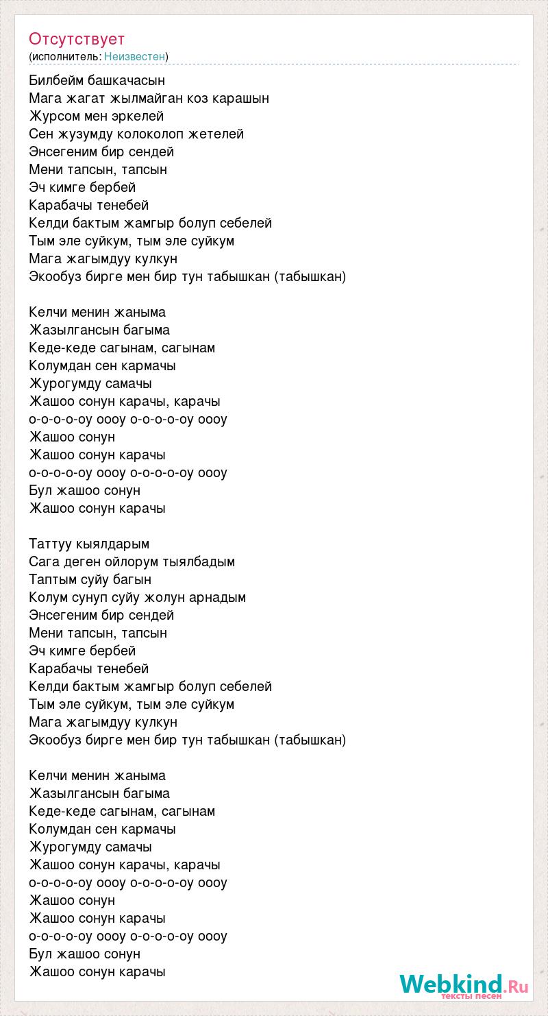Билбейм башкачасын Мага жагат жылмайган коз карашын Журсом мен эркелей Сен жузумду колоколоп жетелей Энсегеним бир сендей Мени тапсын, тапсын Эч кимге бербей Карабачы тенебей Келди бактым жамгыр болуп себелей Тым эле суйкум, тым эле суйкум Мага жагымдуу кулкун Экообуз бирге мен бир тун табышкан (табышкан) Келчи менин жаныма Жазылгансын багыма Кеде-кеде сагынам, сагынам Колумдан сен кармачы Журогумду самачы Жашоо сонун карачы, карачы о-о-о-о-оу оооу о-о-о-о-оу оооу Жашоо сонун Жашоо сонун карачы о-о-о-о-оу оооу о-о-о-о-оу оооу Бул жашоо сонун Жашоо сонун карачы Таттуу кыялдарым Сага деген ойлорум тыялбадым Таптым суйу багын Колум сунуп суйу жолун арнадым Энсегеним бир сендей Мени тапсын, тапсын Эч кимге бербей Карабачы тенебей Келди бактым жамгыр болуп себелей Тым эле суйкум, тым эле суйкум Мага жагымдуу кулкун Экообуз бирге мен бир тун табышкан (табышкан) Келчи менин жаныма Жазылгансын багыма Кеде-кеде сагынам, сагынам Колумдан сен кармачы Журогумду самачы Жашоо сонун карачы, карачы о-о-о-о-оу оооу о-о-о-о-оу оооу Жашоо сонун Жашоо сонун карачы о-о-о-о-оу оооу о-о-о-о-оу оооу Бул жашоо сонун Жашоо сонун карачы