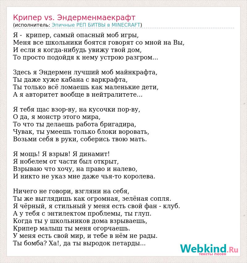 Я - крипер, самый опасный моб игры, Меня все школьники боятся говорят со мной на Вы, И если я когда-нибудь увижу твой дом, То просто подойдя к нему устрою разгром... Здесь я Эндермен лучший моб майнкрафта, Ты даже хуже кабана с варкрафта, Ты только всё ломаешь как маленькие дети, А я авторитет вообще в нейтралитете... Я тебя щас взор-ву, на кусочки пор-ву, О да, я монстр этого мира, То что ты делаешь работа бригадира, Чувак, ты умеешь только блоки воровать, Возьми себя в руки, соберись твою мать. Я мощь! Я взрыв! Я динамит! Я нобелем от части был открыт, Взрываю что хочу, на право и налево, И никто не указ мне даже чья-то королева. Ничего не говори, взгляни на себя, Ты же выглядишь как огромная, зелёная сопля. Я чёрный, я стильный у меня есть свой фан - клуб. А у тебя с энтилектом проблемы, ты глуп. Когда ты у школьников дома взрываешь, Крипер малыш ты меня огорчаешь. У меня есть свой мир, и тебе в нём не рады. Ты бомба? Ха!, да ты выродок петарды...