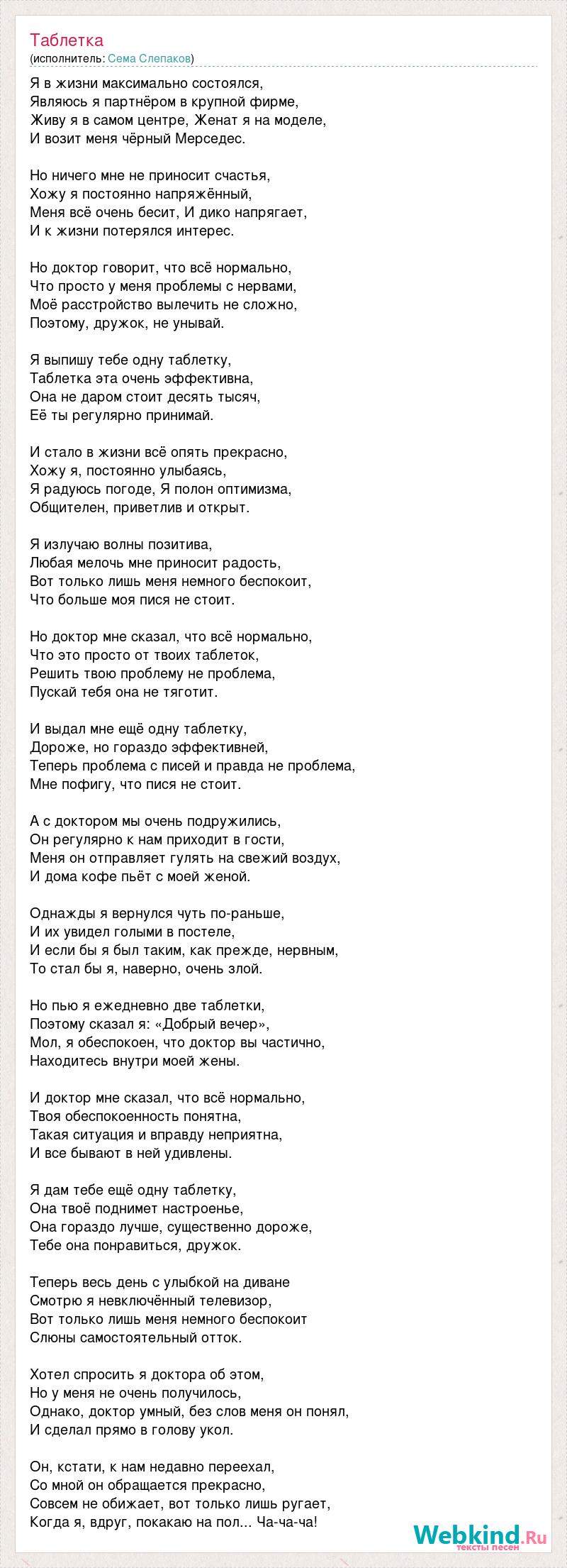 Я в жизни максимально состоялся, Являюсь я партнёром в крупной фирме, Живу я в самом центре, Женат я на моделе, И возит меня чёрный Мерседес. Но ничего мне не приносит счастья, Хожу я постоянно напряжённый, Меня всё очень бесит, И дико напрягает, И к жизни потерялся интерес. Но доктор говорит, что всё нормально, Что просто у меня проблемы с нервами, Моё расстройство вылечить не сложно, Поэтому, дружок, не унывай. Я выпишу тебе одну таблетку, Таблетка эта очень эффективна, Она не даром стоит десять тысяч, Её ты регулярно принимай. И стало в жизни всё опять прекрасно, Хожу я, постоянно улыбаясь, Я радуюсь погоде, Я полон оптимизма, Общителен, приветлив и открыт. Я излучаю волны позитива, Любая мелочь мне приносит радость, Вот только лишь меня немного беспокоит, Что больше моя пися не стоит. Но доктор мне сказал, что всё нормально, Что это просто от твоих таблеток, Решить твою проблему не проблема, Пускай тебя она не тяготит. И выдал мне ещё одну таблетку, Дороже, но гораздо эффективней, Теперь проблема с писей и правда не проблема, Мне пофигу, что пися не стоит. А с доктором мы очень подружились, Он регулярно к нам приходит в гости, Меня он отправляет гулять на свежий воздух, И дома кофе пьёт с моей женой. Однажды я вернулся чуть по-раньше, И их увидел голыми в постеле, И если бы я был таким, как прежде, нервным, То стал бы я, наверно, очень злой. Но пью я ежедневно две таблетки, Поэтому сказал я: «Добрый вечер», Мол, я обеспокоен, что доктор вы частично, Находитесь внутри моей жены. И доктор мне сказал, что всё нормально, Твоя обеспокоенность понятна, Такая ситуация и вправду неприятна, И все бывают в ней удивлены. Я дам тебе ещё одну таблетку, Она твоё поднимет настроенье, Она гораздо лучше, существенно дороже, Тебе она понравиться, дружок. Теперь весь день с улыбкой на диване Смотрю я невключённый телевизор, Вот только лишь меня немного беспокоит Слюны самостоятельный отток. Хотел спросить я доктора об этом, Но у меня не очень получилось, Однако, доктор умный, без слов меня он понял, И сделал прямо в голову укол. Он, кстати, к нам недавно переехал, Со мной он обращается прекрасно, Совсем не обижает, вот только лишь ругает, Когда я, вдруг, покакаю на пол... Ча-ча-ча!