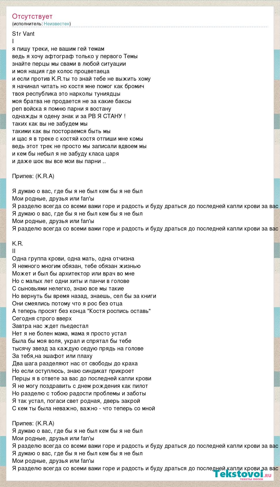 S1r Vant I я пишу треки, не вашим гей темам ведь я хочу афтограф только у первого Темы знайте перцы мы свами в любой ситуации и моя нация где колос процветаеца и если против K.R.ты то знай тебе не выжить хому я начинал читать но костя мне помог как бромич твоя республика это нарколы туниядцы моя братва не продается не за какие баксы реп войска я помню парни я востану однажды я одену знак и за РВ Я СТАНУ ! таких как вы не забудем мы такими как вы постораемся быть мы и щас я в треке с костяй костя отпиши мне комы ведь этот трек не просто мы записали вдвоем мы и кем бы небыл я не забуду класа царя и даже шок вы все мои вы парни .. Припев: (K.R.A) Я думаю о вас, где бы я не был кем бы я не был Мои родные, друзья или fan'ы Я разделю всегда со всеми вами горе и радость и буду драться до последней капли крови за вас Я думаю о вас, где бы я не был кем бы я не был Мои родные, друзья или fan'ы Я разделю всегда со всеми вами горе и радость и буду драться до последней капли крови за вас K.R. II Одна группа крови, одна мать, одна отчизна Я немного многим обязан, тебе обязан жизнью Может и был бы архитектор или врач во мне Но с малых лет одни хиты и панчи в голове С сыновьями нелегко, знаю все мы такие Но вернуть бы время назад, знаешь, сел бы за книги Они смеялись потому что я рос без отца А теперь просят без конца "Костя роспись оставь" Сегодня строго вверх Завтра нас ждет пьедестал Нет я не болен мама, мама я просто устал Была бы моя воля, украл и спрятал бы тебе тысячу звезд за каждую седую прядь на голове За тебя,на эшафот или плаху Два шага разделяют нас от свободы до краха Но если оступлюсь, знаю синдикат прикроет Перцы я в ответе за вас до последней капли крови Я не могу поздравить с днем рождения как пилот Но разделю с тобою радости проблемы и заботы Я так устал, погаси свет родная, дверь закрой С кем ты была неважно, важно - что теперь со мной Припев: (K.R.A) Я думаю о вас, где бы я не был кем бы я не был Мои родные, друзья или fan'ы Я разделю всегда со всеми вами горе и радость и буду драться до последней капли крови за вас Я думаю о вас, где бы я не был кем бы я не был Мои родные, друзья или fan'ы Я разделю всегда со всеми вами горе и радость и буду драться до последней капли крови за вас