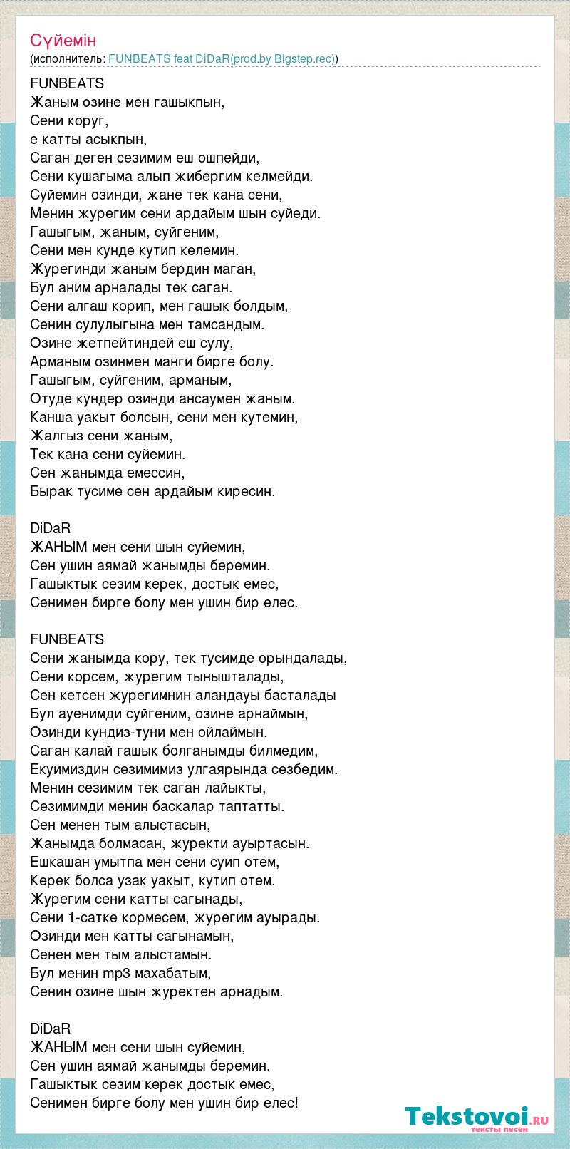 FUNBEATS Жаным озине мен гашыкпын, Сени коруг, е катты асыкпын, Саган деген сезимим еш ошпейди, Сени кушагыма алып жибергим келмейди. Суйемин озинди, жане тек кана сени, Менин журегим сени ардайым шын суйеди. Гашыгым, жаным, суйгеним, Сени мен кунде кутип келемин. Журегинди жаным бердин маган, Бул аним арналады тек саган. Сени алгаш корип, мен гашык болдым, Сенин сулулыгына мен тамсандым. Озине жетпейтиндей еш сулу, Арманым озинмен манги бирге болу. Гашыгым, суйгеним, арманым, Отуде кундер озинди ансаумен жаным. Канша уакыт болсын, сени мен кутемин, Жалгыз сени жаным, Тек кана сени суйемин. Сен жанымда емессин, Бырак тусиме сен ардайым киресин. DiDaR ЖАНЫМ мен сени шын суйемин, Сен ушин аямай жанымды беремин. Гашыктык сезим керек, достык емес, Сенимен бирге болу мен ушин бир елес. FUNBEATS Сени жанымда кору, тек тусимде орындалады, Сени корсем, журегим тынышталады, Сен кетсен журегимнин аландауы басталады Бул ауенимди суйгеним, озине арнаймын, Озинди кундиз-туни мен ойлаймын. Саган калай гашык болганымды билмедим, Екуимиздин сезимимиз улгаярында сезбедим. Менин сезимим тек саган лайыкты, Сезимимди менин баскалар таптатты. Сен менен тым алыстасын, Жанымда болмасан, журекти ауыртасын. Ешкашан умытпа мен сени суип отем, Керек болса узак уакыт, кутип отем. Журегим сени катты сагынады, Сени 1-сатке кормесем, журегим ауырады. Озинди мен катты сагынамын, Сенен мен тым алыстамын. Бул менин mp3 махабатым, Сенин озине шын журектен арнадым. DiDaR ЖАНЫМ мен сени шын суйемин, Сен ушин аямай жанымды беремин. Гашыктык сезим керек достык емес, Сенимен бирге болу мен ушин бир елес!