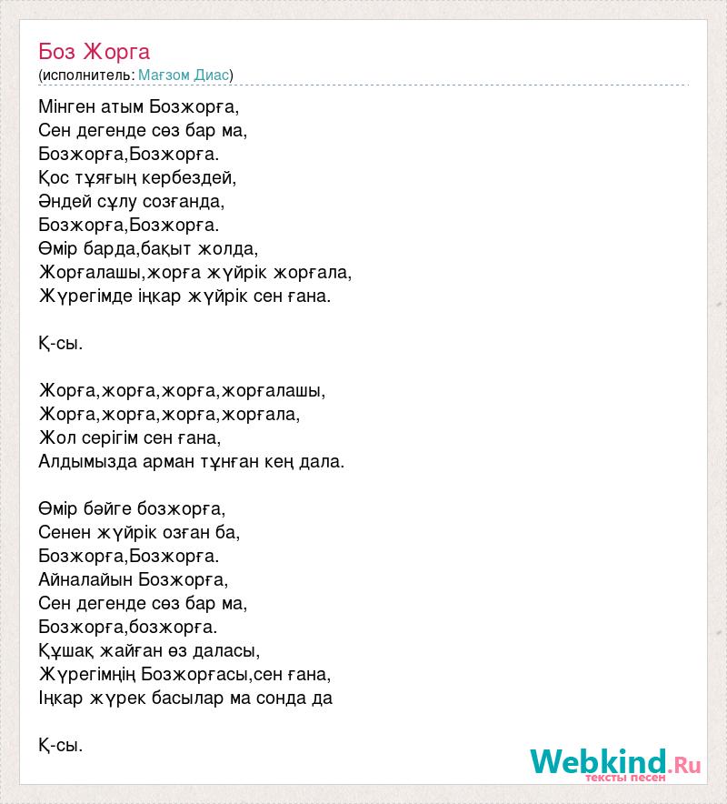 Мінген атым Бозжорға, Сен дегенде сөз бар ма, Бозжорға,Бозжорға. Қос тұяғың кербездей, Әндей сұлу созғанда, Бозжорға,Бозжорға. Өмір барда,бақыт жолда, Жорғалашы,жорға жүйрік жорғала, Жүрегімде іңкар жүйрік сен ғана. Қ-сы. Жорға,жорға,жорға,жорғалашы, Жорға,жорға,жорға,жорғала, Жол серігім сен ғана, Алдымызда арман тұнған кең дала. Өмір бәйге бозжорға, Сенен жүйрік озған ба, Бозжорға,Бозжорға. Айналайын Бозжорға, Сен дегенде сөз бар ма, Бозжорға,бозжорға. Құшақ жайған өз даласы, Жүрегімңің Бозжорғасы,сен ғана, Іңкар жүрек басылар ма сонда да Қ-сы.