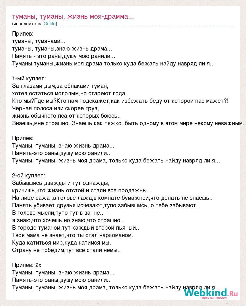 Припев: туманы, туманами... туманы, туманы,знаю жизнь драма... Память - это раны,душу мою ранили... Туманы,туманы,жизнь моя драма,только куда бежать найду навряд ли я.. 1-ый куплет: За глазами дым,за облаками туман, хотел остаться молодым,но стареют года.. Кто мы?Где мы?Кто нам подскажет,как избежать беду от которой нас мажет?! Черная полоса или скорее груз, жизнь обычного пса,от которых боюсь.. Знаешь,мне страшно..Знаешь,как тяжко ,быть одному в этом мире некому неважным.. Припев: Туманы, туманы, знаю жизнь драма... Память-это раны,душу мою ранили.. Туманы, туманы, жизнь моя драма, только куда бежать найду навряд ли я... 2-ой куплет: Забывшись дважды и тут однажды, кричишь,что жизнь отстой и стали все продажны.. На лице сажа ,в голове лажа,в комнате бумажной,что делать не знаешь.. Память убивает,друзья исчезают,тупо забывшись, о тебе забывают... В голове мысли,тупо тут в ванне.. я знаю,что хочешь,но знаю,что страшно.. В городе туманом,тут каждый второй пьяный.. Твоя мама не знает,что ты стал наркоманом. Куда катиться мир,куда катимся мы, Страну не победим,тут все стали немы.. Припев: 2х Туманы, туманы, знаю жизнь драма... Память-это раны,душу мою ранили.. Туманы, туманы, жизнь моя драма, только куда бежать найду навряд ли я...