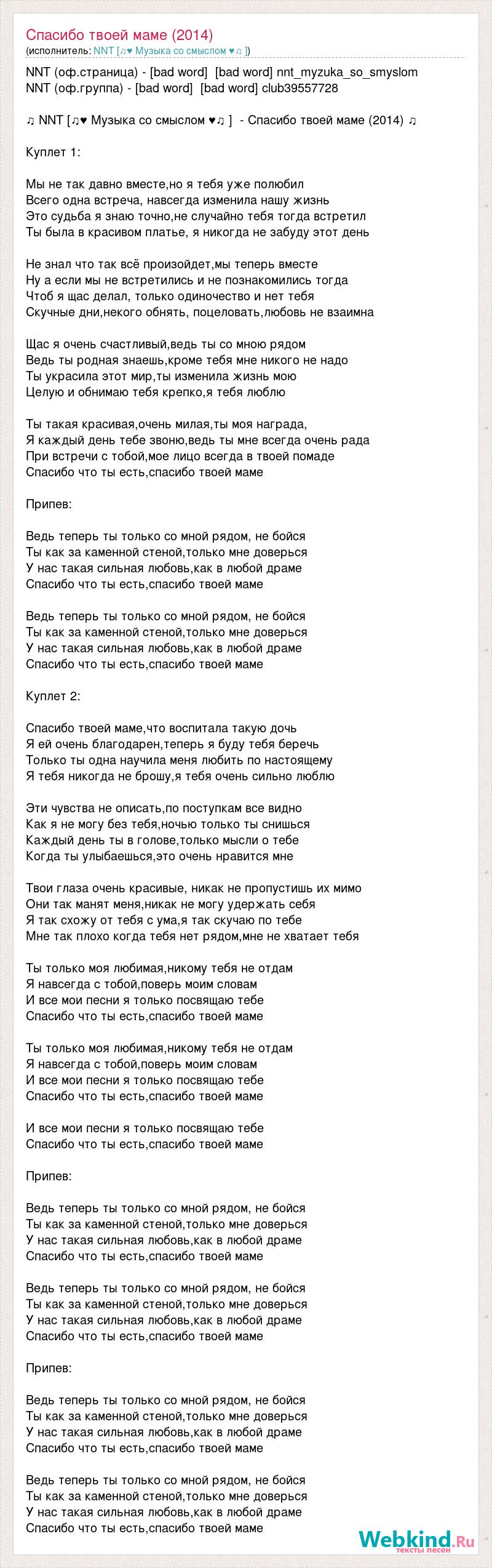 NNT (оф.страница) - [bad word] [bad word] nnt_myzuka_so_smyslom NNT (оф.группа) - [bad word] [bad word] club39557728 ♫ NNT [♫♥ Музыка со смыслом ♥♫ ] - Спасибо твоей маме (2014) ♫ Куплет 1: Мы не так давно вместе,но я тебя уже полюбил Всего одна встреча, навсегда изменила нашу жизнь Это судьба я знаю точно,не случайно тебя тогда встретил Ты была в красивом платье, я никогда не забуду этот день Не знал что так всё произойдет,мы теперь вместе Ну а если мы не встретились и не познакомились тогда Чтоб я щас делал, только одиночество и нет тебя Скучные дни,некого обнять, поцеловать,любовь не взаимна Щас я очень счастливый,ведь ты со мною рядом Ведь ты родная знаешь,кроме тебя мне никого не надо Ты украсила этот мир,ты изменила жизнь мою Целую и обнимаю тебя крепко,я тебя люблю Ты такая красивая,очень милая,ты моя награда, Я каждый день тебе звоню,ведь ты мне всегда очень рада При встречи с тобой,мое лицо всегда в твоей помаде Спасибо что ты есть,спасибо твоей маме Припев: Ведь теперь ты только со мной рядом, не бойся Ты как за каменной стеной,только мне доверься У нас такая сильная любовь,как в любой драме Спасибо что ты есть,спасибо твоей маме Ведь теперь ты только со мной рядом, не бойся Ты как за каменной стеной,только мне доверься У нас такая сильная любовь,как в любой драме Спасибо что ты есть,спасибо твоей маме Куплет 2: Спасибо твоей маме,что воспитала такую дочь Я ей очень благодарен,теперь я буду тебя беречь Только ты одна научила меня любить по настоящему Я тебя никогда не брошу,я тебя очень сильно люблю Эти чувства не описать,по поступкам все видно Как я не могу без тебя,ночью только ты снишься Каждый день ты в голове,только мысли о тебе Когда ты улыбаешься,это очень нравится мне Твои глаза очень красивые, никак не пропустишь их мимо Они так манят меня,никак не могу удержать себя Я так схожу от тебя с ума,я так скучаю по тебе Мне так плохо когда тебя нет рядом,мне не хватает тебя Ты только моя любимая,никому тебя не отдам Я навсегда с тобой,поверь моим словам И все мои песни я только посвящаю тебе Спасибо что ты есть,спасибо твоей маме Ты только моя любимая,никому тебя не отдам Я навсегда с тобой,поверь моим словам И все мои песни я только посвящаю тебе Спасибо что ты есть,спасибо твоей маме И все мои песни я только посвящаю тебе Спасибо что ты есть,спасибо твоей маме Припев: Ведь теперь ты только со мной рядом, не бойся Ты как за каменной стеной,только мне доверься У нас такая сильная любовь,как в любой драме Спасибо что ты есть,спасибо твоей маме Ведь теперь ты только со мной рядом, не бойся Ты как за каменной стеной,только мне доверься У нас такая сильная любовь,как в любой драме Спасибо что ты есть,спасибо твоей маме Припев: Ведь теперь ты только со мной рядом, не бойся Ты как за каменной стеной,только мне доверься У нас такая сильная любовь,как в любой драме Спасибо что ты есть,спасибо твоей маме Ведь теперь ты только со мной рядом, не бойся Ты как за каменной стеной,только мне доверься У нас такая сильная любовь,как в любой драме Спасибо что ты есть,спасибо твоей маме
