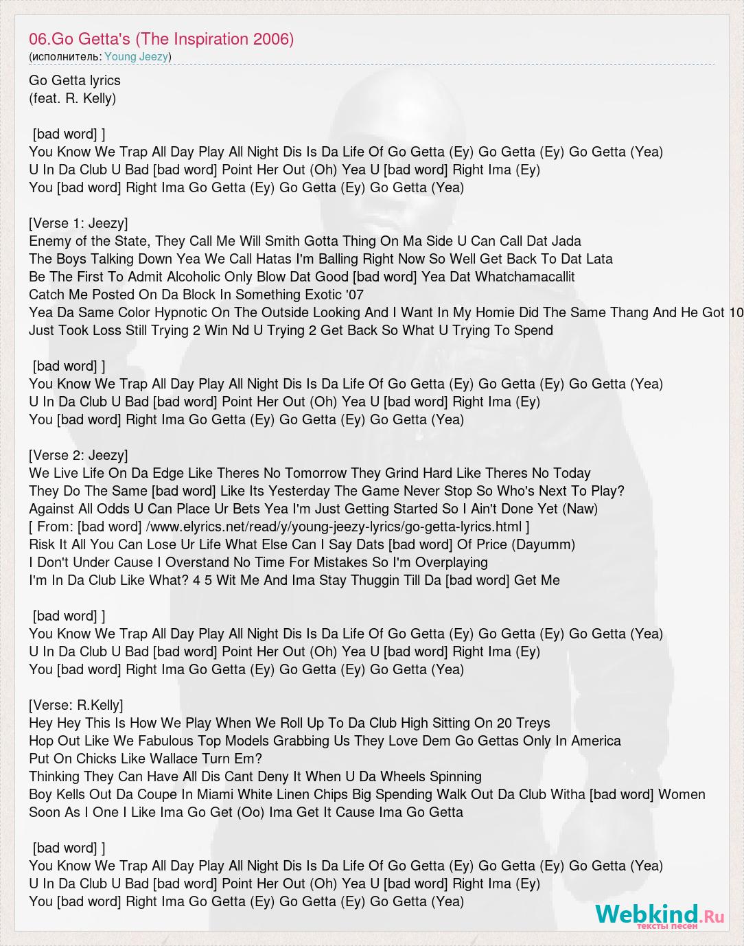 Go Getta lyrics (feat. R. Kelly) [bad word] ] You Know We Trap All Day Play All Night Dis Is Da Life Of Go Getta (Ey) Go Getta (Ey) Go Getta (Yea) U In Da Club U Bad [bad word] Point Her Out (Oh) Yea U [bad word] Right Ima (Ey) You [bad word] Right Ima Go Getta (Ey) Go Getta (Ey) Go Getta (Yea) [Verse 1: Jeezy] Enemy of the State, They Call Me Will Smith Gotta Thing On Ma Side U Can Call Dat Jada The Boys Talking Down Yea We Call Hatas I'm Balling Right Now So Well Get Back To Dat Lata Be The First To Admit Alcoholic Only Blow Dat Good [bad word] Yea Dat Whatchamacallit Catch Me Posted On Da Block In Something Exotic '07 Yea Da Same Color Hypnotic On The Outside Looking And I Want In My Homie Did The Same Thang And He Got 10 Just Took Loss Still Trying 2 Win Nd U Trying 2 Get Back So What U Trying To Spend [bad word] ] You Know We Trap All Day Play All Night Dis Is Da Life Of Go Getta (Ey) Go Getta (Ey) Go Getta (Yea) U In Da Club U Bad [bad word] Point Her Out (Oh) Yea U [bad word] Right Ima (Ey) You [bad word] Right Ima Go Getta (Ey) Go Getta (Ey) Go Getta (Yea) [Verse 2: Jeezy] We Live Life On Da Edge Like Theres No Tomorrow They Grind Hard Like Theres No Today They Do The Same [bad word] Like Its Yesterday The Game Never Stop So Who's Next To Play? Against All Odds U Can Place Ur Bets Yea I'm Just Getting Started So I Ain't Done Yet (Naw) [ From: [bad word] /www.elyrics.net/read/y/young-jeezy-lyrics/go-getta-lyrics.html ] Risk It All You Can Lose Ur Life What Else Can I Say Dats [bad word] Of Price (Dayumm) I Don't Under Cause I Overstand No Time For Mistakes So I'm Overplaying I'm In Da Club Like What? 4 5 Wit Me And Ima Stay Thuggin Till Da [bad word] Get Me [bad word] ] You Know We Trap All Day Play All Night Dis Is Da Life Of Go Getta (Ey) Go Getta (Ey) Go Getta (Yea) U In Da Club U Bad [bad word] Point Her Out (Oh) Yea U [bad word] Right Ima (Ey) You [bad word] Right Ima Go Getta (Ey) Go Getta (Ey) Go Getta (Yea) [Verse: R.Kelly] Hey Hey This Is How We Play When We Roll Up To Da Club High Sitting On 20 Treys Hop Out Like We Fabulous Top Models Grabbing Us They Love Dem Go Gettas Only In America Put On Chicks Like Wallace Turn Em? Thinking They Can Have All Dis Cant Deny It When U Da Wheels Spinning Boy Kells Out Da Coupe In Miami White Linen Chips Big Spending Walk Out Da Club Witha [bad word] Women Soon As I One I Like Ima Go Get (Oo) Ima Get It Cause Ima Go Getta [bad word] ] You Know We Trap All Day Play All Night Dis Is Da Life Of Go Getta (Ey) Go Getta (Ey) Go Getta (Yea) U In Da Club U Bad [bad word] Point Her Out (Oh) Yea U [bad word] Right Ima (Ey) You [bad word] Right Ima Go Getta (Ey) Go Getta (Ey) Go Getta (Yea)