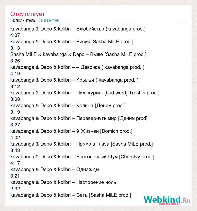 kavabanga & Depo & kolibri – Влюбийство (kavabanga prod.) 4:37 kavabanga & Depo & kolibri – Рисуя [Sasha MiLE prod.] 3:13 Sasha MiLE & kavabanga & Depo – Выше [Sasha MiLE prod.] 3:26 kavabanga & Depo & kolibri – – Девочка ( kavabanga prod. ) 4:19 kavabanga & Depo & kolibri – Крылья ( kavabanga prod. ) 3:12 kavabanga & Depo & kolibri – Пил, курил [bad word] Troshin prod.) 3:08 kavabanga & Depo & kolibri – Кольца [Деним prod.] 3:19 kavabanga & Depo & kolibri – Перевернуть мир [Деним prod] 3:27 kavabanga & Depo & kolibri – 9 Жизней [Domich prod.] 4:02 kavabanga & Depo & kolibri – Прямо в глаза [Sasha MiLE prod.] 3:43 kavabanga & Depo & kolibri – Бесконечный Шум [Cherstvy prod.] 4:17 kavabanga & Depo & kolibri – Однажды 3:21 kavabanga & Depo & kolibri – Настроение ноль 2:32 kavabanga & Depo & kolibri – Сеть [Sasha MiLE prod.]