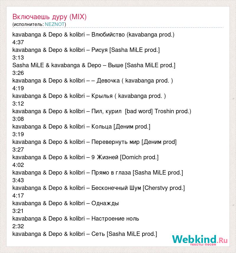 kavabanga & Depo & kolibri – Влюбийство (kavabanga prod.) 4:37 kavabanga & Depo & kolibri – Рисуя [Sasha MiLE prod.] 3:13 Sasha MiLE & kavabanga & Depo – Выше [Sasha MiLE prod.] 3:26 kavabanga & Depo & kolibri – – Девочка ( kavabanga prod. ) 4:19 kavabanga & Depo & kolibri – Крылья ( kavabanga prod. ) 3:12 kavabanga & Depo & kolibri – Пил, курил [bad word] Troshin prod.) 3:08 kavabanga & Depo & kolibri – Кольца [Деним prod.] 3:19 kavabanga & Depo & kolibri – Перевернуть мир [Деним prod] 3:27 kavabanga & Depo & kolibri – 9 Жизней [Domich prod.] 4:02 kavabanga & Depo & kolibri – Прямо в глаза [Sasha MiLE prod.] 3:43 kavabanga & Depo & kolibri – Бесконечный Шум [Cherstvy prod.] 4:17 kavabanga & Depo & kolibri – Однажды 3:21 kavabanga & Depo & kolibri – Настроение ноль 2:32 kavabanga & Depo & kolibri – Сеть [Sasha MiLE prod.]