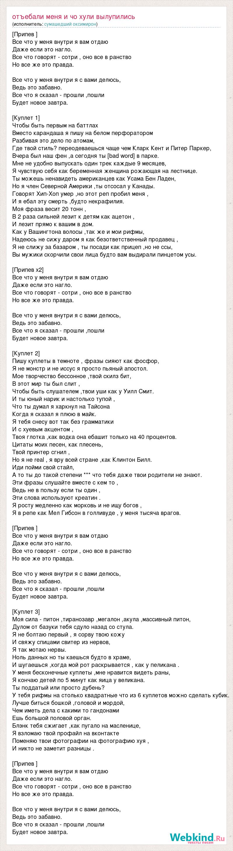 [Припев ] Все что у меня внутри я вам отдаю Даже если это нагло. Все что говорят - сотри , оно все в ранство Но все же это правда. Все что у меня внутри я с вами делюсь, Ведь это забавно. Все что я сказал - прошли ,пошли Будет новое завтра. [Куплет 1] Чтобы быть первым на баттлах Вместо карандаша я пишу на белом перфоратором Разбивая это дело по атомам, Где твой стиль? переодеваешься чаще чем Кларк Кент и Питер Паркер, Вчера был наш фен ,а сегодня ты [bad word] в парке. Мне не удобно выпускать один трек каждые 9 месяцев, Я чувствую себя как беременная женщина рожающая на лестнице. Ты можешь ненавидеть американцев как Усама Бен Ладен, Но я член Северной Америки ,ты отсосал у Канады. Говорят Хип-Хоп умер ,но этот реп пробил меня , И я ебал эту смерть ,будто некрафилия. Моя фраза весит 20 тонн , В 2 раза сильней лезит к детям как ацетон , И лезит прямо к вашим в дом. Как у Вашингтона волосы ,так же и мои рифмы, Надеюсь не сижу даром я как безответственный продавец , Я не слижу за базаром , ты посади как прицеп ,но не ссы, Вы мужики скорчили свои лица будто вам выдирали пинцетом усы. [Припев x2] Все что у меня внутри я вам отдаю Даже если это нагло. Все что говорят - сотри , оно все в ранство Но все же это правда. Все что у меня внутри я с вами делюсь, Ведь это забавно. Все что я сказал - прошли ,пошли Будет новое завтра. [Куплет 2] Пишу куплеты в темноте , фразы сияют как фосфор, Я не монстр и не иссус я просто пьяный апостол. Мое творчество бессонное ,твой скилз бит, В этот мир ты был слит , Чтобы быть слушателем ,твои уши как у Уилл Смит. И ты юный нарик и настолько тупой , Что ты думал я харкнул на Тайсона Когда я сказал я плюю в майк. Я тебя снесу вот так без грамматики И с хуевым акцентом , Твоя глотка ,как водка она ебашит только на 40 процентов. Цитаты моих песен, как плесень, Твой принтер сгнил , Но я не real , я вру всей стране ,как Клинтон Билл. Иди пойми свой стайл, А то ты до такой степени *** что тебя даже твои родители не знают. Эти фразы слушайте вместе с кем то , Ведь не в пользу если ты один , Эти слова используют креатин . Я росту медленно как морковь и не ищу богов , Я в репе как Мел Гибсон в голливуде , у меня тысяча врагов. [Припев ] Все что у меня внутри я вам отдаю Даже если это нагло. Все что говорят - сотри , оно все в ранство Но все же это правда. Все что у меня внутри я с вами делюсь, Ведь это забавно. Все что я сказал - прошли ,пошли Будет новое завтра. [Куплет 3] Моя сила - питон ,тиранозавр ,мегалон ,акула ,массивный питон, Дулом от базуки тебя сдуло назад со стула. Я не болтаю первый , я сорву твою кожу И свяжу спицами свитер из нервов, Я так мотаю нервы. Ноль данных но ты каешься будто в храме, И шугаешься ,когда мой рот раскрывается , как у пеликана . У меня бесконечные куплеты ,мне нравится видеть раны, Я кончаю детей по 5 минут как яица у великана. Ты поддатый или просто дубень? У тебя рифмы на столько квадратные что из 6 куплетов можно сделать кубик. Лучше биться бошкой ,головой и мордой, Чем иметь дела с какими то гандонами Ешь большой половой орган. Блэнк тебя сжигает ,как пугало на масленице, Я взломаю твой профайл на вконтакте Поменяю твои фотографии на фотографию хуя , И никто не заметит разницы . [Припев ] Все что у меня внутри я вам отдаю Даже если это нагло. Все что говорят - сотри , оно все в ранство Но все же это правда. Все что у меня внутри я с вами делюсь, Ведь это забавно. Все что я сказал - прошли ,п