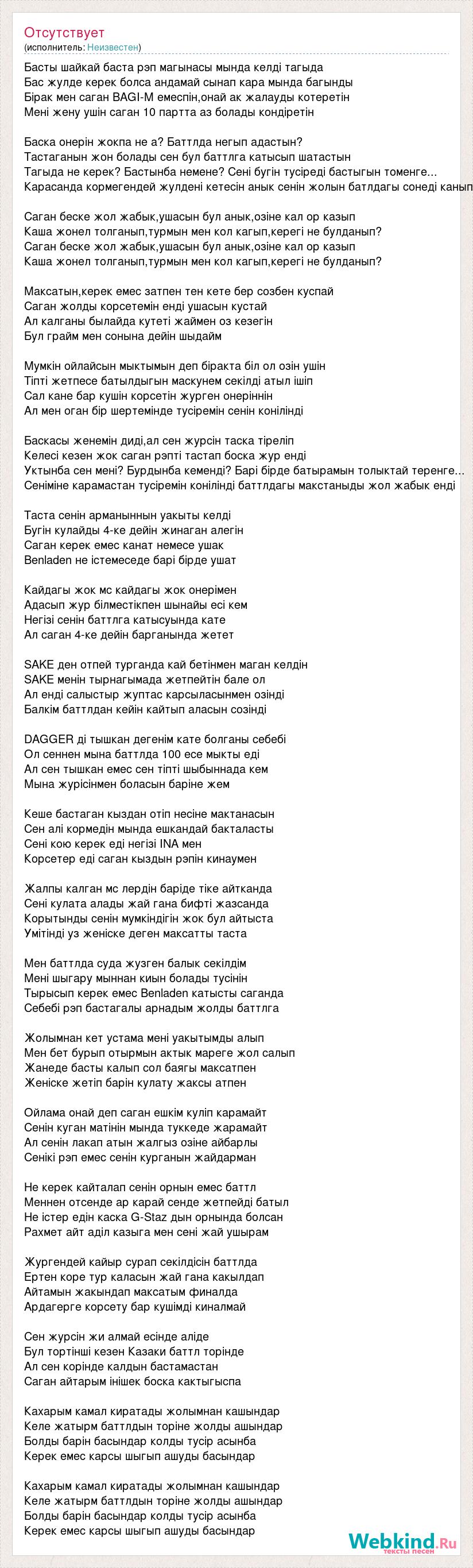 Басты шайкай баста рэп магынасы мында келді тагыда Бас жулде керек болса андамай сынап кара мында багынды Бірак мен саган BAGI-M емеспін,онай ак жалауды котеретін Мені жену ушін саган 10 партта аз болады кондіретін Баска онерін жокпа не а? Баттлда негып адастын? Тастаганын жон болады сен бул баттлга катысып шатастын Тагыда не керек? Бастынба немене? Сені бугін тусіреді бастыгын томенге... Карасанда кормегендей жулдені кетесін анык сенін жолын батлдагы сонеді канып Саган беске жол жабык,ушасын бул анык,озіне кал ор казып Каша жонел толганып,турмын мен кол кагып,керегі не булданып? Саган беске жол жабык,ушасын бул анык,озіне кал ор казып Каша жонел толганып,турмын мен кол кагып,керегі не булданып? Максатын,керек емес затпен тен кете бер созбен куспай Саган жолды корсетемін енді ушасын кустай Ал калганы былайда кутеті жаймен оз кезегін Бул грайм мен сонына дейін шыдайм Мумкін ойлайсын мыктымын деп біракта біл ол озін ушін Тіпті жетпесе батылдыгын маскунем секілді атыл ішіп Сал кане бар кушін корсетін журген онеріннін Ал мен оган бір шертемінде тусіремін сенін конілінді Баскасы женемін диді,ал сен журсін таска тіреліп Келесі кезен жок саган рэпті тастап боска жур енді Уктынба сен мені? Бурдынба кеменді? Барі бірде батырамын толыктай теренге... Сеніміне карамастан тусіремін конілінді баттлдагы макстаныды жол жабык енді Таста сенін арманыннын уакыты келді Бугін кулайды 4-ке дейін жинаган алегін Саган керек емес канат немесе ушак Benladen не істемеседе барі бірде ушат Кайдагы жок мс кайдагы жок онерімен Адасып жур білместікпен шынайы есі кем Негізі сенін баттлга катысуында кате Ал саган 4-ке дейін барганында жетет SAKE ден отпей турганда кай бетінмен маган келдін SAKE менін тырнагымада жетпейтін бале ол Ал енді салыстыр жуптас карсыласынмен озінді Балкім баттлдан кейін кайтып аласын созінді DAGGER ді тышкан дегенім кате болганы себебі Ол сеннен мына баттлда 100 есе мыкты еді Ал сен тышкан емес сен тіпті шыбыннада кем Мына журісінмен боласын баріне жем Кеше бастаган кыздан отіп несіне мактанасын Сен алі кормедін мында ешкандай бакталасты Сені кою керек еді негізі INA мен Корсетер еді саган кыздын рэпін кинаумен Жалпы калган мс лердін баріде тіке айтканда Сені кулата алады жай гана бифті жазсанда Корытынды сенін мумкіндігін жок бул айтыста Умітінді уз женіске деген максатты таста Мен баттлда суда жузген балык секілдім Мені шыгару мыннан киын болады тусінін Тырысып керек емес Benladen катысты саганда Себебі рэп бастагалы арнадым жолды баттлга Жолымнан кет устама мені уакытымды алып Мен бет бурып отырмын актык мареге жол салып Жанеде басты калып сол баягы максатпен Женіске жетіп барін кулату жаксы атпен Ойлама онай деп саган ешкім куліп карамайт Сенін куган матінін мында туккеде жарамайт Ал сенін лакап атын жалгыз озіне айбарлы Сенікі рэп емес сенін курганын жайдарман Не керек кайталап сенін орнын емес баттл Меннен отсенде ар карай сенде жетпейді батыл Не істер едін каска G-Staz дын орнында болсан Рахмет айт аділ казыга мен сені жай ушырам Жургендей кайыр сурап секілдісін баттлда Ертен коре тур каласын жай гана какылдап Айтамын жакындап максатым финалда Ардагерге корсету бар кушімді киналмай Сен журсін жи алмай есінде аліде Бул тортінші кезен Казаки баттл торінде Ал сен корінде калдын бастамастан Саган айтарым інішек боска кактыгыспа Кахар