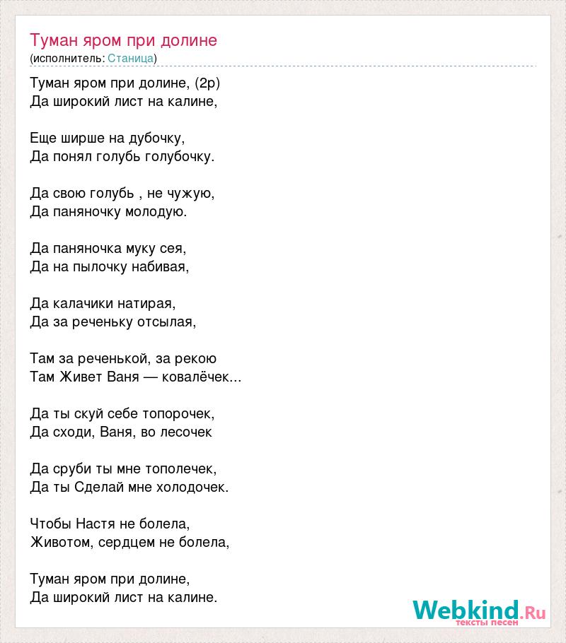 Туман яром при долине, (2р) Да широкий лист на калине, Еще ширше на дубочку, Да понял голубь голубочку. Да свою голубь , не чужую, Да паняночку молодую. Да паняночка муку сея, Да на пылочку набивая, Да калачики натирая, Да за реченьку отсылая, Там за реченькой, за рекою Там Живет Ваня — ковалёчек... Да ты скуй себе топорочек, Да сходи, Ваня, во лесочек Да сруби ты мне тополечек, Да ты Сделай мне холодочек. Чтобы Настя не болела, Животом, сердцем не болела, Туман яром при долине, Да широкий лист на калине.