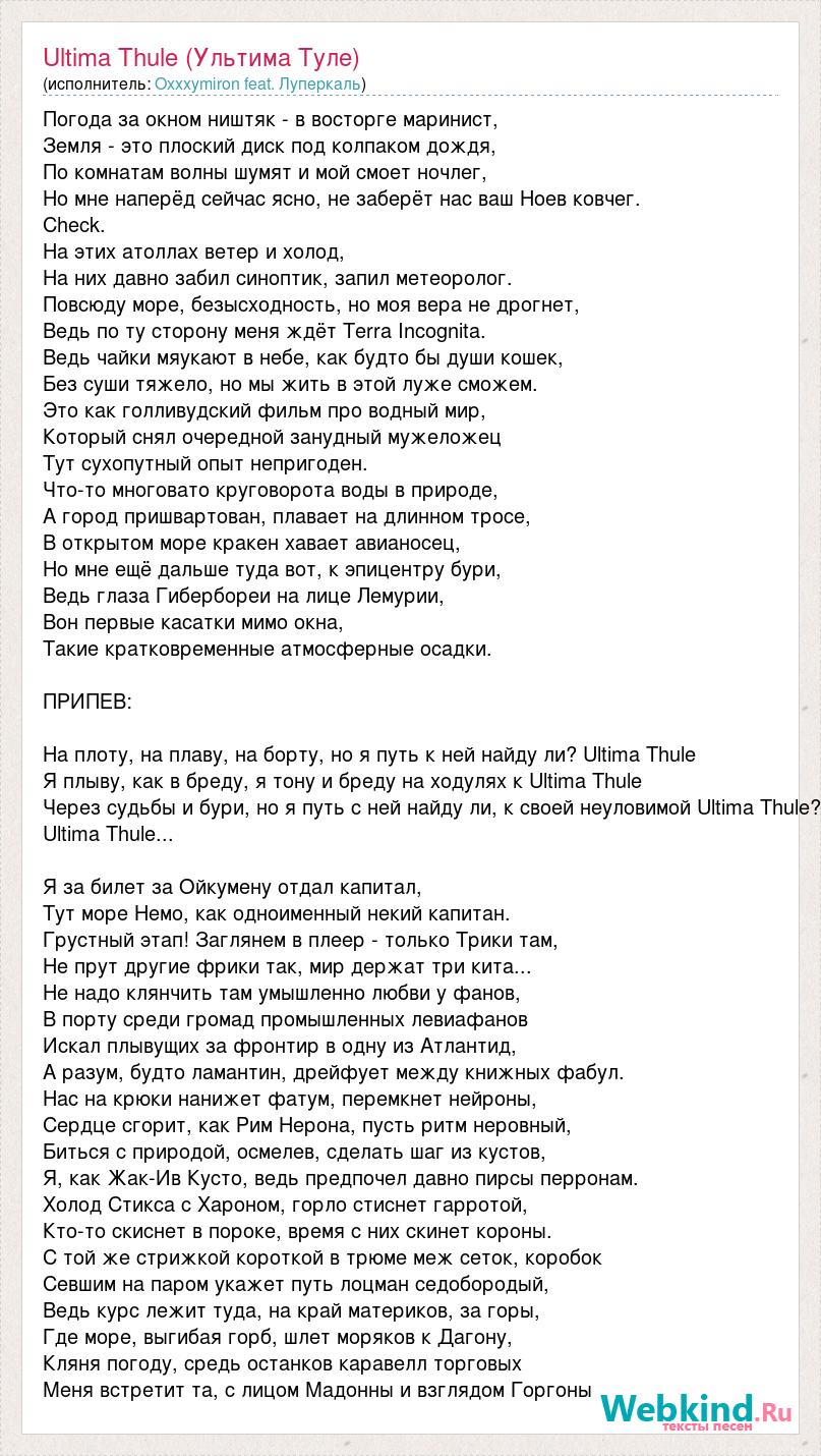 Погода за окном ништяк - в восторге маринист, Земля - это плоский диск под колпаком дождя, По комнатам волны шумят и мой смоет ночлег, Но мне наперёд сейчас ясно, не заберёт нас ваш Ноев ковчег. Check. На этих атоллах ветер и холод, На них давно забил синоптик, запил метеоролог. Повсюду море, безысходность, но моя вера не дрогнет, Ведь по ту сторону меня ждёт Terra Incognita. Ведь чайки мяукают в небе, как будто бы души кошек, Без суши тяжело, но мы жить в этой луже сможем. Это как голливудский фильм про водный мир, Который снял очередной занудный мужеложец Тут сухопутный опыт непригоден. Что-то многовато круговорота воды в природе, А город пришвартован, плавает на длинном тросе, В открытом море кракен хавает авианосец, Но мне ещё дальше туда вот, к эпицентру бури, Ведь глаза Гибербореи на лице Лемурии, Вон первые касатки мимо окна, Такие кратковременные атмосферные осадки. ПРИПЕВ: На плоту, на плаву, на борту, но я путь к ней найду ли? Ultima Thule Я плыву, как в бреду, я тону и бреду на ходулях к Ultima Thule Через судьбы и бури, но я путь с ней найду ли, к своей неуловимой Ultima Thule? Ultima Thule... Я за билет за Ойкумену отдал капитал, Тут море Немо, как одноименный некий капитан. Грустный этап! Заглянем в плеер - только Трики там, Не прут другие фрики так, мир держат три кита... Не надо клянчить там умышленно любви у фанов, В порту среди громад промышленных левиафанов Искал плывущих за фронтир в одну из Атлантид, А разум, будто ламантин, дрейфует между книжных фабул. Нас на крюки нанижет фатум, перемкнет нейроны, Сердце сгорит, как Рим Нерона, пусть ритм неровный, Биться с природой, осмелев, сделать шаг из кустов, Я, как Жак-Ив Кусто, ведь предпочел давно пирсы перронам. Холод Стикса с Хароном, горло стиснет гарротой, Кто-то скиснет в пороке, время с них скинет короны. С той же стрижкой короткой в трюме меж сеток, коробок Севшим на паром укажет путь лоцман седобородый, Ведь курс лежит туда, на край материков, за горы, Где море, выгибая горб, шлет моряков к Дагону, Кляня погоду, средь останков каравелл торговых Меня встретит та, с лицом Мадонны и взглядом Горгоны