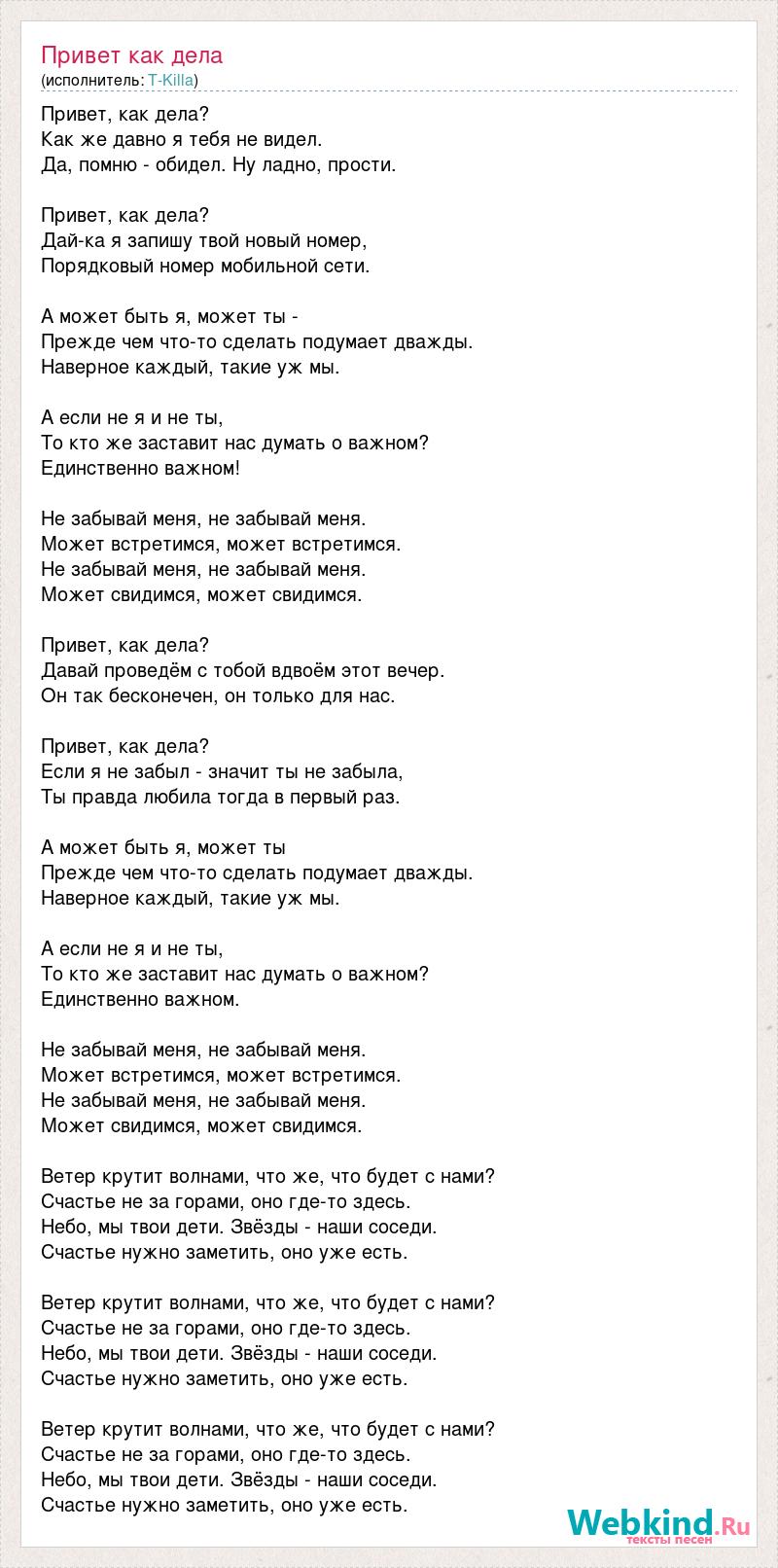 Привет, как дела? Как же давно я тебя не видел. Да, помню - обидел. Ну ладно, прости. Привет, как дела? Дай-ка я запишу твой новый номер, Порядковый номер мобильной сети. А может быть я, может ты - Прежде чем что-то сделать подумает дважды. Наверное каждый, такие уж мы. А если не я и не ты, То кто же заставит нас думать о важном? Единственно важном! Не забывай меня, не забывай меня. Может встретимся, может встретимся. Не забывай меня, не забывай меня. Может свидимся, может свидимся. Привет, как дела? Давай проведём с тобой вдвоём этот вечер. Он так бесконечен, он только для нас. Привет, как дела? Если я не забыл - значит ты не забыла, Ты правда любила тогда в первый раз. А может быть я, может ты Прежде чем что-то сделать подумает дважды. Наверное каждый, такие уж мы. А если не я и не ты, То кто же заставит нас думать о важном? Единственно важном. Не забывай меня, не забывай меня. Может встретимся, может встретимся. Не забывай меня, не забывай меня. Может свидимся, может свидимся. Ветер крутит волнами, что же, что будет с нами? Счастье не за горами, оно где-то здесь. Небо, мы твои дети. Звёзды - наши соседи. Счастье нужно заметить, оно уже есть. Ветер крутит волнами, что же, что будет с нами? Счастье не за горами, оно где-то здесь. Небо, мы твои дети. Звёзды - наши соседи. Счастье нужно заметить, оно уже есть. Ветер крутит волнами, что же, что будет с нами? Счастье не за горами, оно где-то здесь. Небо, мы твои дети. Звёзды - наши соседи. Счастье нужно заметить, оно уже есть.