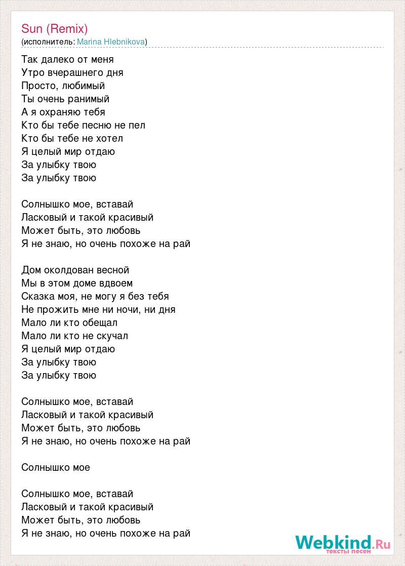Так далеко от меня Утро вчерашнего дня Просто, любимый Ты очень ранимый А я охраняю тебя Кто бы тебе песню не пел Кто бы тебе не хотел Я целый мир отдаю За улыбку твою За улыбку твою Солнышко мое, вставай Ласковый и такой красивый Может быть, это любовь Я не знаю, но очень похоже на рай Дом околдован весной Мы в этом доме вдвоем Сказка моя, не могу я без тебя Не прожить мне ни ночи, ни дня Мало ли кто обещал Мало ли кто не скучал Я целый мир отдаю За улыбку твою За улыбку твою Солнышко мое, вставай Ласковый и такой красивый Может быть, это любовь Я не знаю, но очень похоже на рай Солнышко мое Солнышко мое, вставай Ласковый и такой красивый Может быть, это любовь Я не знаю, но очень похоже на рай