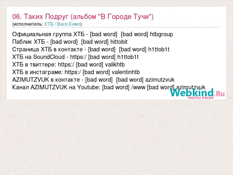 Официальная группа ХТБ - [bad word] [bad word] htbgroup Паблик ХТБ - [bad word] [bad word] hittobit Страница ХТБ в контакте - [bad word] [bad word] h1ttob1t ХТБ на SoundCloud - https:/ [bad word] h1ttob1t ХТБ в твиттере: https:/ [bad word] valikhtb ХТБ в инстаграме: https:/ [bad word] valentinhtb AZIMUTZVUK в контакте - [bad word] [bad word] azimutzvuk Канал AZIMUTZVUK на Youtube: [bad word] /www [bad word] azimutzvuk