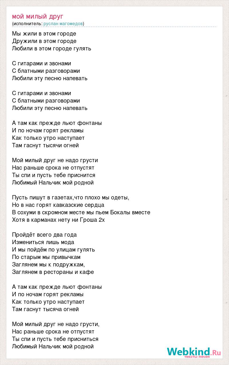 Мы жили в этом городе Дружили в этом городе Любили в этом городе гулять С гитарами и звонами С блатными разговорами Любили эту песню напевать С гитарами и звонами С блатными разговорами Любили эту песню напевать А там как прежде льют фонтаны И по ночам горят рекламы Как только утро наступает Там гаснут тысячи огней Мой милый друг не надо грусти Нас раньше срока не отпустят Ты спи и пусть тебе приснится Любимый Нальчик мой родной Пусть пишут в газетах,что плохо мы одеты, Но в нас горят кавказские сердца В сохуми в скромном месте мы пьем Бокалы вместе Хотя в карманах нету ни Гроша 2х Пройдёт всего два года Измениться лишь мода И мы пойдём по улицам гулять По старым мы привычкам Заглянем мы к подружкам, Заглянем в рестораны и кафе А там как прежде льют фонтаны И по ночам горят рекламы Как только утро наступает Там гаснут тысяча огней Мой милый друг не надо грусти, Нас раньше срока не отпустят Ты спи и пусть тебе присниться Любимый Нальчик мой родной