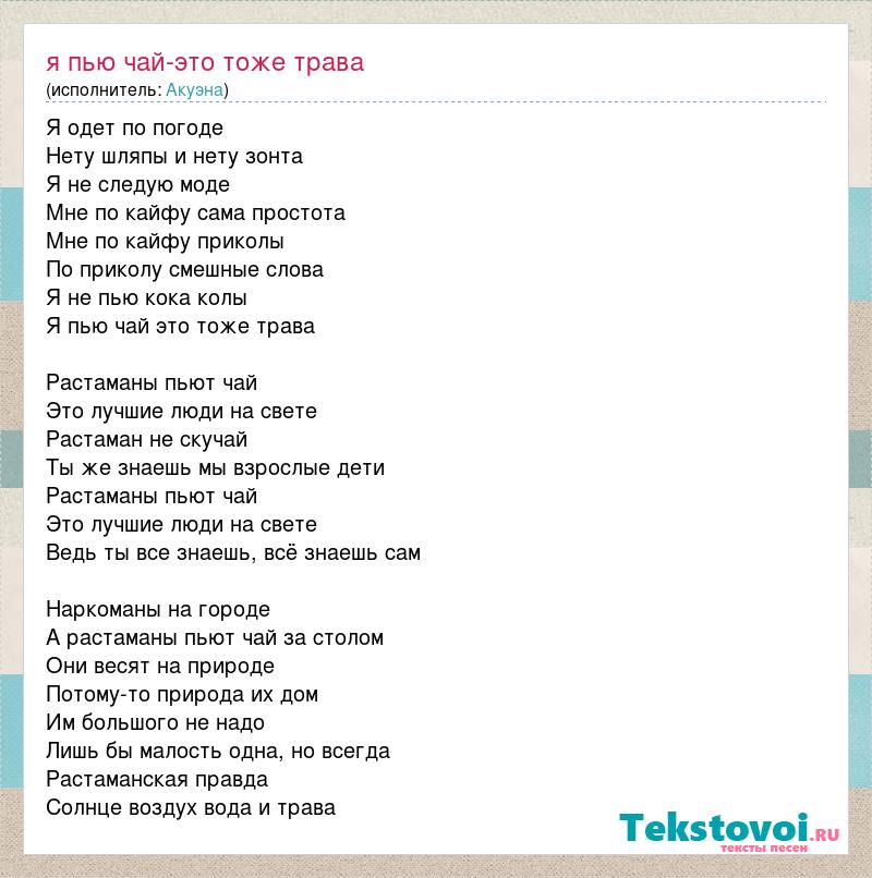 Я одет по погоде Нету шляпы и нету зонта Я не следую моде Мне по кайфу сама простота Мне по кайфу приколы По приколу смешные слова Я не пью кока колы Я пью чай это тоже трава Растаманы пьют чай Это лучшие люди на свете Растаман не скучай Ты же знаешь мы взрослые дети Растаманы пьют чай Это лучшие люди на свете Ведь ты все знаешь, всё знаешь сам Наркоманы на городе А растаманы пьют чай за столом Они весят на природе Потому-то природа их дом Им большого не надо Лишь бы малость одна, но всегда Растаманская правда Солнце воздух вода и трава