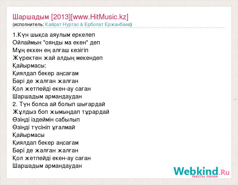 1.Күн шықса аяулым еркелеп Ойлаймын "оянды ма екен" деп Мұң еккен ең алғаш кезігіп Жүректен жай алдың мекендеп Қайырмасы: Қиялдап бекер аңсағам Бәрі де жалған жалған Қол жетпейді екен-ау саған Шаршадым армандаудан 2. Түн болса ай болып шығардай Жұлдыз боп жымыңдап тұрардай Өзіңді іздеймін сабылып Өзіңді түсініп ұғалмай Қайырмасы Қиялдап бекер аңсағам Бәрі де жалған жалған Қол жетпейді екен-ау саған Шаршадым армандаудан