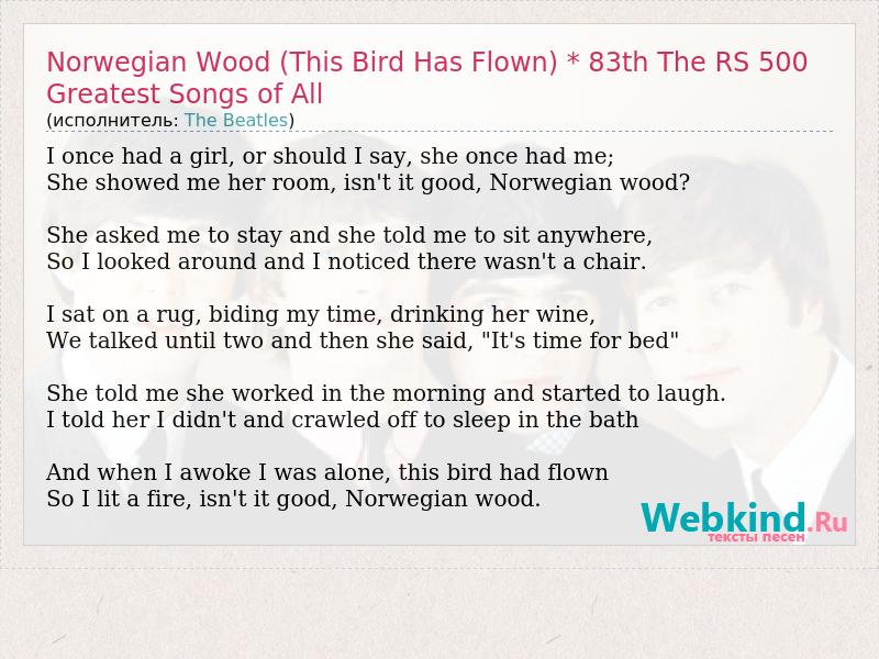 I once had a girl, or should I say, she once had me; She showed me her room, isn't it good, Norwegian wood? She asked me to stay and she told me to sit anywhere, So I looked around and I noticed there wasn't a chair. I sat on a rug, biding my time, drinking her wine, We talked until two and then she said, "It's time for bed" She told me she worked in the morning and started to laugh. I told her I didn't and crawled off to sleep in the bath And when I awoke I was alone, this bird had flown So I lit a fire, isn't it good, Norwegian wood.