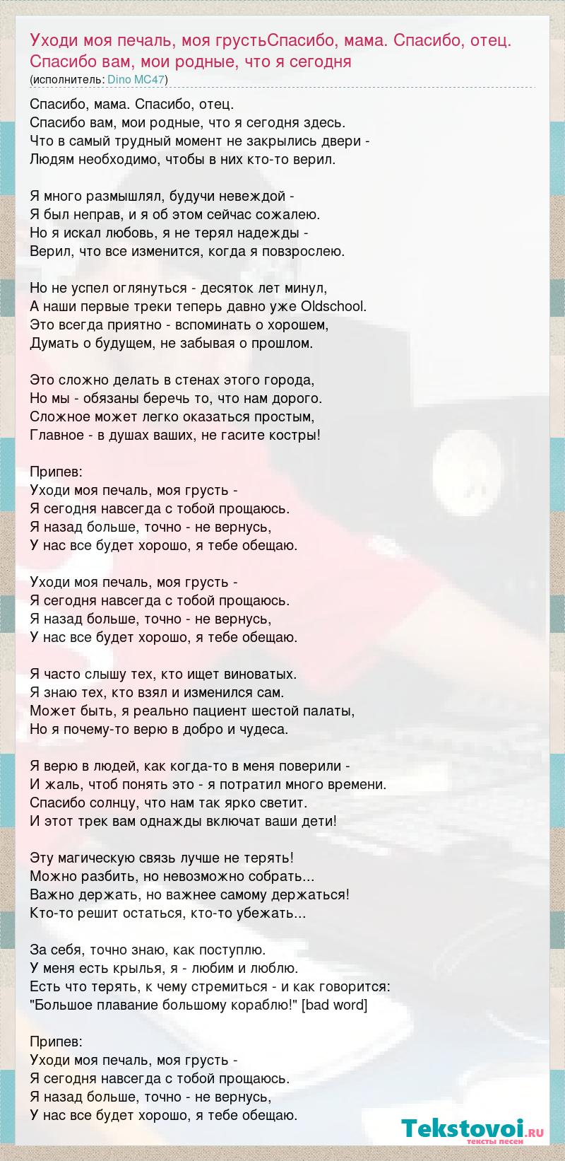 Главная→Исполнители→DINO MC47→Уходи моя печаль, моя грустьСпасибо, мама. Спасибо, отец. Спасибо вам, мои р