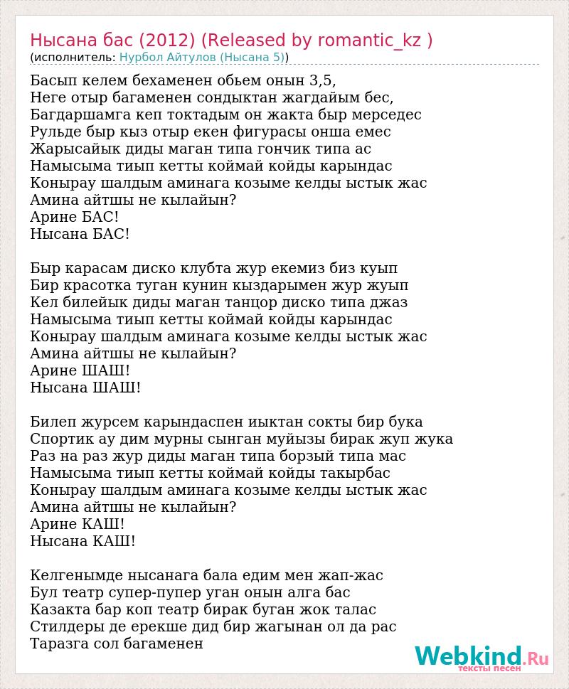 Басып келем бехаменен обьем онын 3,5, Неге отыр багаменен сондыктан жагдайым бес, Багдаршамга кеп токтадым он жакта быр мерседес Рульде быр кыз отыр екен фигурасы онша емес Жарысайык диды маган типа гончик типа ас Намысыма тиып кетты коймай койды карындас Конырау шалдым аминага козыме келды ыстык жас Амина айтшы не кылайын? Арине БАС! Нысана БАС! Быр карасам диско клубта жур екемиз биз куып Бир красотка туган кунин кыздарымен жур жуып Кел билейык диды маган танцор диско типа джаз Намысыма тиып кетты коймай койды карындас Конырау шалдым аминага козыме келды ыстык жас Амина айтшы не кылайын? Арине ШАШ! Нысана ШАШ! Билеп журсем карындаспен иыктан сокты бир бука Спортик ау дим мурны сынган муйызы бирак жуп жука Раз на раз жур диды маган типа борзый типа мас Намысыма тиып кетты коймай койды такырбас Конырау шалдым аминага козыме келды ыстык жас Амина айтшы не кылайын? Арине КАШ! Нысана КАШ! Келгенымде нысанага бала едим мен жап-жас Бул театр супер-пупер уган онын алга бас Казакта бар коп театр бирак буган жок талас Стилдеры де ерекше дид бир жагынан ол да рас Таразга сол багаменен
