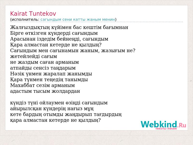 Жалғыздықтың күйімен бас кештім бағымнан Бірге өткізген күндерді сағындым Арасынан іздедім бейнеңді, сағындым Қара алмастан кетерде не қылдың? Сағындым мен сағынамын жаным, жазығым не? жетейлейді сағым не жаздым саған арманым атпайды сенсіз таңдарым Нәзік үнмен жаралап жанымды Қара түнмен теңедің танымды Махаббат сезім арманым адастым тысым жолдардан күндіз түні ойлаумен өзіңді сағындым айырылсқан күндерің нағыз мұң кете бардың отымды жаңдырып тағдырдың қара алмастан кетерде не қылдың?