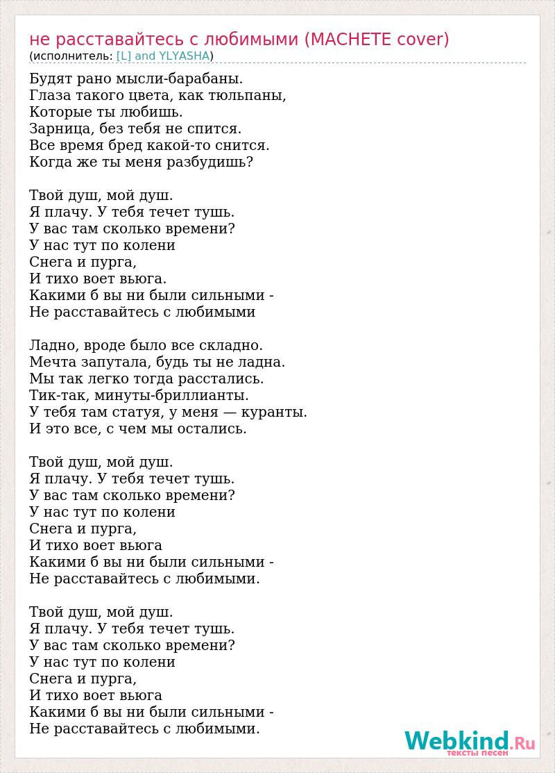 Будят рано мысли-барабаны. Глаза такого цвета, как тюльпаны, Которые ты любишь. Зарница, без тебя не спится. Все время бред какой-то снится. Когда же ты меня разбудишь? Твой душ, мой душ. Я плачу. У тебя течет тушь. У вас там сколько времени? У нас тут по колени Снега и пурга, И тихо воет вьюга. Какими б вы ни были сильными - Не расставайтесь с любимыми Ладно, вроде было все складно. Мечта запутала, будь ты не ладна. Мы так легко тогда расстались. Тик-так, минуты-бриллианты. У тебя там статуя, у меня — куранты. И это все, с чем мы остались. Твой душ, мой душ. Я плачу. У тебя течет тушь. У вас там сколько времени? У нас тут по колени Снега и пурга, И тихо воет вьюга Какими б вы ни были сильными - Не расставайтесь с любимыми. Твой душ, мой душ. Я плачу. У тебя течет тушь. У вас там сколько времени? У нас тут по колени Снега и пурга, И тихо воет вьюга Какими б вы ни были сильными - Не расставайтесь с любимыми.