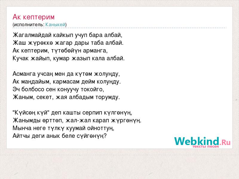 Жагалмайдай кайкып учуп бара албай, Жаш жүрөккө жагар дары таба албай. Ак кептерим, түтөбөйүн арманга, Кучак жайып, кумар жазып кала албай. Асманга учсаң мен да күтөм жолуңду, Ак маңдайым, кармасам дейм колуңду. Эч болбосо сен конуучу токойго, Жаным, секет, жая албадым торумду. "Күйсөң күй" деп кашты серпип күлгөнүң, Жанымды өрттөп, жал-жал карап жүргөнүң. Мынча неге түлкү куумай ойноттуң, Айтчы деги анык беле сүйгөнүң?