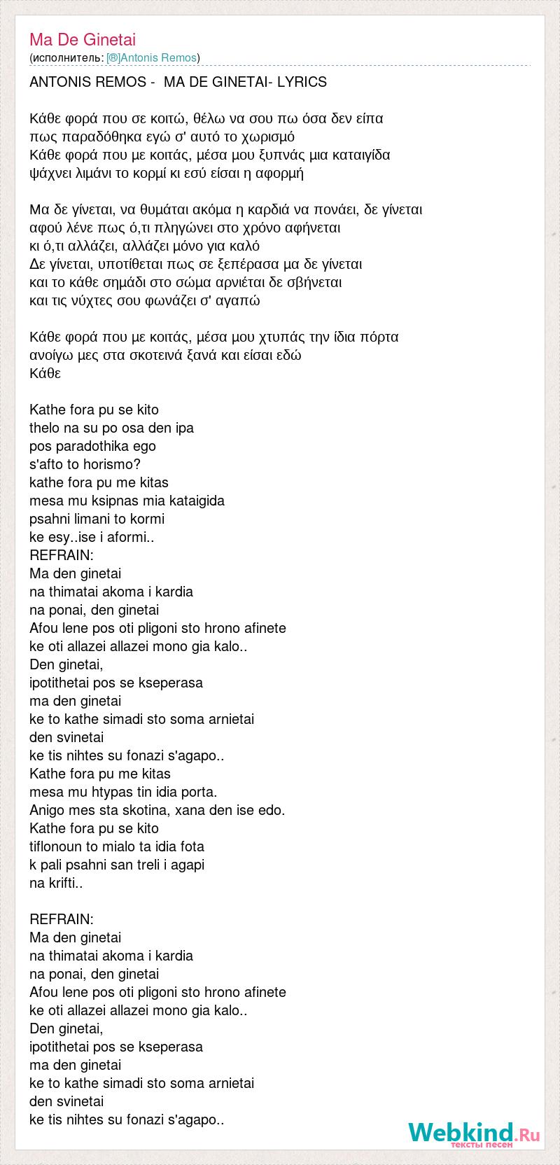 ANTONIS REMOS - MA DE GINETAI- LYRICS Κάθε φορά που σε κοιτώ, θέλω να σου πω όσα δεν είπα πως παραδόθηκα εγώ σ' αυτό το χωρισμό Κάθε φορά που με κοιτάς, μέσα μου ξυπνάς μια καταιγίδα ψάχνει λιμάνι το κορμί κι εσύ είσαι η αφορμή Μα δε γίνεται, να θυμάται ακόμα η καρδιά να πονάει, δε γίνεται αφού λένε πως ό,τι πληγώνει στο χρόνο αφήνεται κι ό,τι αλλάζει, αλλάζει μόνο για καλό Δε γίνεται, υποτίθεται πως σε ξεπέρασα μα δε γίνεται και το κάθε σημάδι στο σώμα αρνιέται δε σβήνεται και τις νύχτες σου φωνάζει σ' αγαπώ Κάθε φορά που με κοιτάς, μέσα μου χτυπάς την ίδια πόρτα ανοίγω μες στα σκοτεινά ξανά και είσαι εδώ Κάθε Kathe fora pu se kito thelo na su po osa den ipa pos paradothika ego s'afto to horismo? kathe fora pu me kitas mesa mu ksipnas mia kataigida psahni limani to kormi ke esy..ise i aformi.. REFRAIN: Ma den ginetai na thimatai akoma i kardia na ponai, den ginetai Afou lene pos oti pligoni sto hrono afinete ke oti allazei allazei mono gia kalo.. Den ginetai, ipotithetai pos se kseperasa ma den ginetai ke to kathe simadi sto soma arnietai den svinetai ke tis nihtes su fonazi s'agapo.. Kathe fora pu me kitas mesa mu htypas tin idia porta. Anigo mes sta skotina, xana den ise edo. Kathe fora pu se kito tiflonoun to mialo ta idia fota k pali psahni san treli i agapi na krifti.. REFRAIN: Ma den ginetai na thimatai akoma i kardia na ponai, den ginetai Afou lene pos oti pligoni sto hrono afinete ke oti allazei allazei mono gia kalo.. Den ginetai, ipotithetai pos se kseperasa ma den ginetai ke to kathe simadi sto soma arnietai den svinetai ke tis nihtes su fonazi s'agapo..