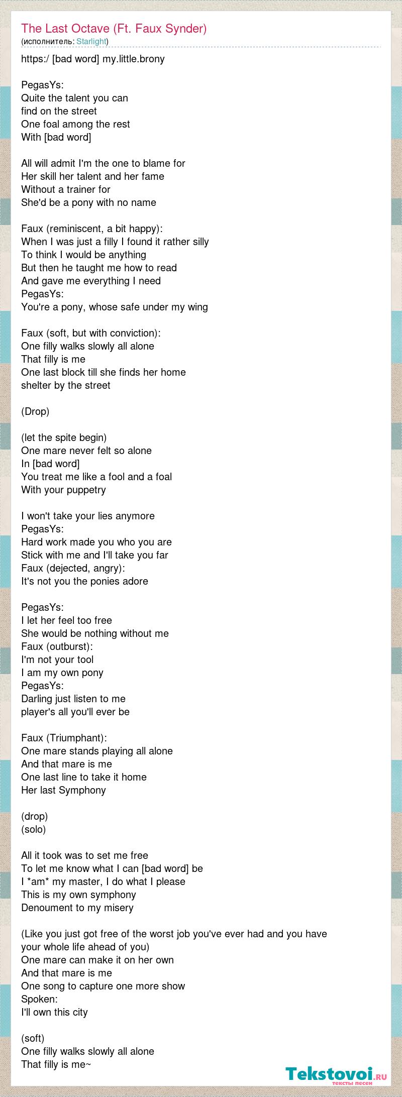 https:/ [bad word] my.little.brony PegasYs: Quite the talent you can find on the street One foal among the rest With skill complete All will admit I'm the one to blame for Her skill her talent and her fame Without a trainer for She'd be a pony with no name Faux (reminiscent, a bit happy): When I was just a filly I found it rather silly To think I would be anything But then he taught me how to read And gave me everything I need PegasYs: You're a pony, whose safe under my wing Faux (soft, but with conviction): One filly walks slowly all alone That filly is me One last block till she finds her home shelter by the street (Drop) (let the spite begin) One mare never felt so alone In your company You treat me like a fool and a foal With your puppetry I won't take your lies anymore PegasYs: Hard work made you who you are Stick with me and I'll take you far Faux (dejected, angry): It's not you the ponies adore PegasYs: I let her feel too free She would be nothing without me Faux (outburst): I'm not your tool I am my own pony PegasYs: Darling just listen to me player's all you'll ever be Faux (Triumphant): One mare stands playing all alone And that mare is me One last line to take it home Her last Symphony (drop) (solo) All it took was to set me free To let me know what I can truly be I *am* my master, I do what I please This is my own symphony Denoument to my misery (Like you just got free of the worst job you've ever had and you have your whole life ahead of you) One mare can make it on her own And that mare is me One song to capture one more show Spoken: I'll own this city (soft) One filly walks slowly all alone That filly is me~