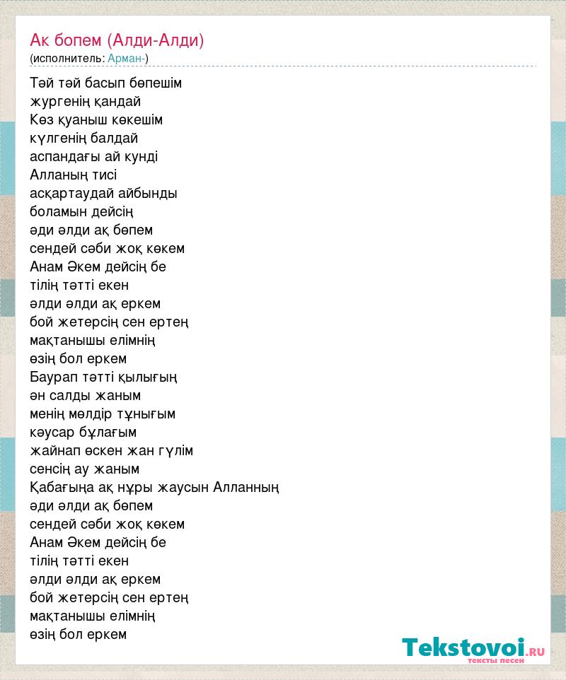 Тәй тәй басып бөпешім жургенің қандай Көз қуаныш көкешім күлгенің балдай аспандағы ай кунді Алланың тисі асқартаудай айбынды боламын дейсің әди әлди ақ бөпем сендей сәби жоқ көкем Анам Әкем дейсің бе тілің тәтті екен әлди әлди ақ еркем бой жетерсің сен ертең мақтанышы елімнің өзің бол еркем Баурап тәтті қылығың ән салды жаным менің мөлдір тұнығым кәусар бұлағым жайнап өскен жан гүлім сенсің ау жаным Қабағыңа ақ нұры жаусын Алланның әди әлди ақ бөпем сендей сәби жоқ көкем Анам Әкем дейсің бе тілің тәтті екен әлди әлди ақ еркем бой жетерсің сен ертең мақтанышы елімнің өзің бол еркем