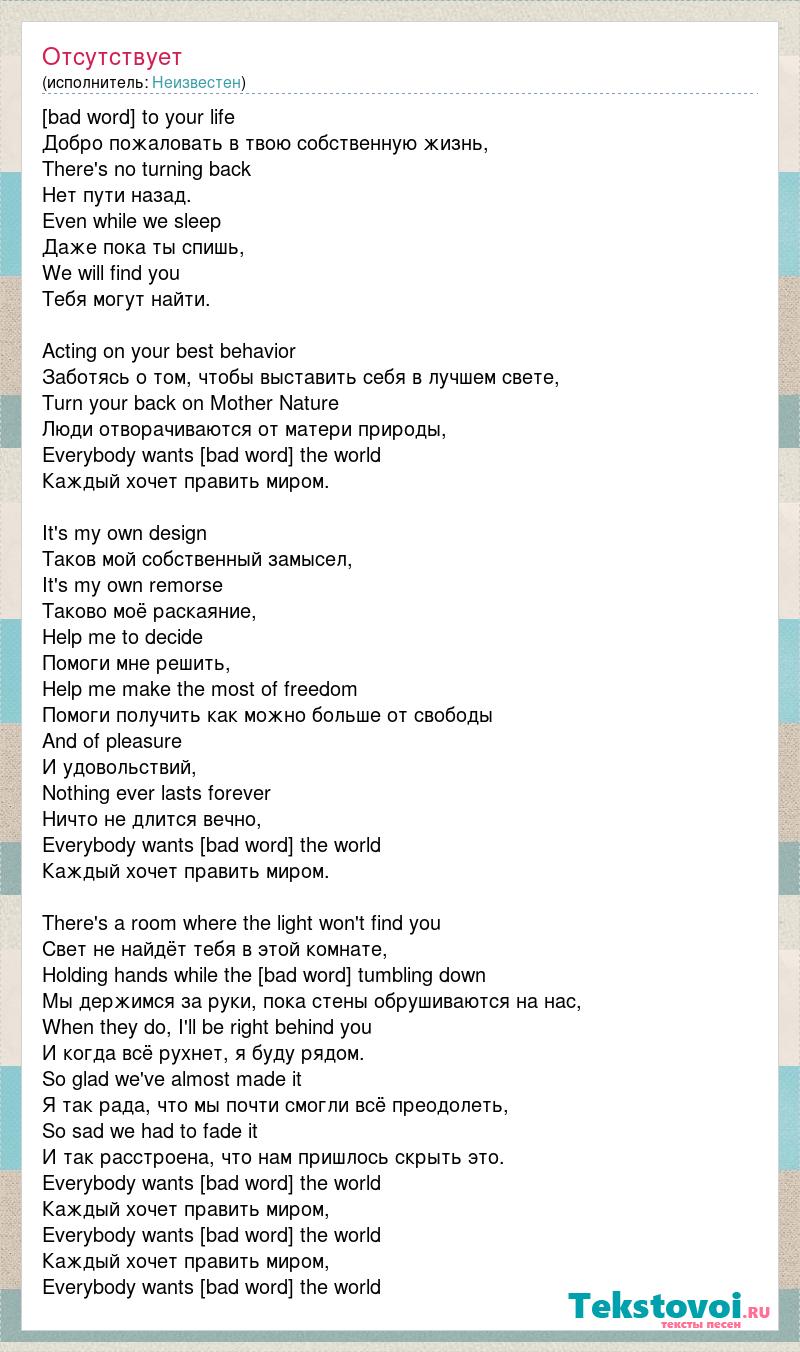 Welcome to your life Добро пожаловать в твою собственную жизнь, There's no turning back Нет пути назад. Even while we sleep Даже пока ты спишь, We will find you Тебя могут найти. Acting on your best behavior Заботясь о том, чтобы выставить себя в лучшем свете, Turn your back on Mother Nature Люди отворачиваются от матери природы, Everybody wants to rule the world Каждый хочет править миром. It's my own design Таков мой собственный замысел, It's my own remorse Таково моё раскаяние, Help me to decide Помоги мне решить, Help me make the most of freedom Помоги получить как можно больше от свободы And of pleasure И удовольствий, Nothing ever lasts forever Ничто не длится вечно, Everybody wants to rule the world Каждый хочет править миром. There's a room where the light won't find you Свет не найдёт тебя в этой комнате, Holding hands while the walls come tumbling down Мы держимся за руки, пока стены обрушиваются на нас, When they do, I'll be right behind you И когда всё рухнет, я буду рядом. So glad we've almost made it Я так рада, что мы почти смогли всё преодолеть, So sad we had to fade it И так расстроена, что нам пришлось скрыть это. Everybody wants to rule the world Каждый хочет править миром, Everybody wants to rule the world Каждый хочет править миром, Everybody wants to rule the world