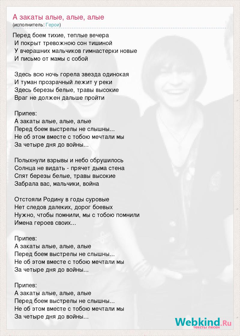 Перед боем тихие, теплые вечера И покрыт тревожною сон тишиной У вчерашних мальчиков гимнастерки новые И письмо от мамы с собой Здесь всю ночь горела звезда одинокая И туман прозрачный лежит у реки Здесь березы белые, травы высокие Враг не должен дальше пройти Припев: А закаты алые, алые, алые Перед боем выстрелы не слышны... Не об этом вместе с тобою мечтали мы За четыре дня до войны... Полыхнули взрывы и небо обрушилось Солнца не видать - прячет дыма стена Спят березы белые, травы высокие Забрала вас, мальчики, война Отстояли Родину в годы суровые Нет следов далеких, дорог боевых Нужно, чтобы помнили, мы с тобою помнили Имена героев своих... Припев: А закаты алые, алые, алые Перед боем выстрелы не слышны... Не об этом вместе с тобою мечтали мы За четыре дня до войны... Припев: А закаты алые, алые, алые Перед боем выстрелы не слышны... Не об этом вместе с тобою мечтали мы За четыре дня до войны...