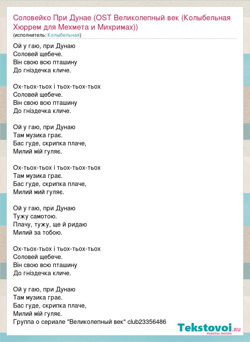 Ой у гаю, при Дунаю Соловей щебече. Він свою всю пташину До гніздечка кличе. Ох-тьох-тьох і тьох-тьох-тьох Соловей щебече. Він свою всю пташину До гніздечка кличе. Ой у гаю, при Дунаю Там музика грає. Бас гуде, скрипка плаче, Милий мій гуляє. Ох-тьох-тьох і тьох-тьох-тьох Там музика грає. Бас гуде, скрипка плаче, Милий мий гуляє. Ой у гаю, при Дунаю Тужу самотою. Плачу, тужу, ще й ридаю Милий за тобою. Ох-тьох-тьох і тьох-тьох-тьох Соловей щебече. Він свою всю пташину До гніздечка кличе. Ой у гаю, при Дунаю Там музика грає. Бас гуде, скрипка плаче, Милий мій гуляє. Группа о сериале "Великолепный век" club23356486