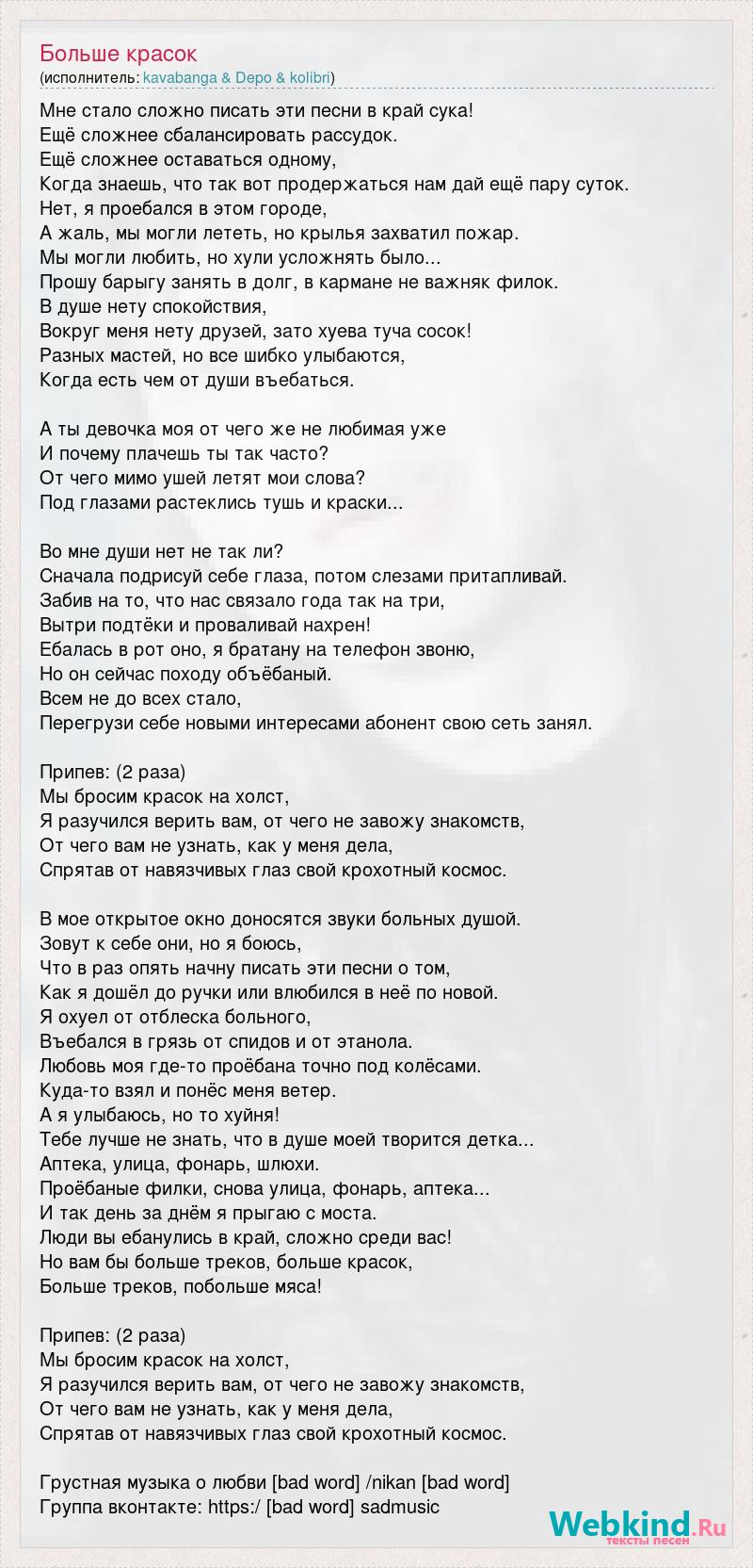 Мне стало сложно писать эти песни в край сука! Ещё сложнее сбалансировать рассудок. Ещё сложнее оставаться одному, Когда знаешь, что так вот продержаться нам дай ещё пару суток. Нет, я проебался в этом городе, А жаль, мы могли лететь, но крылья захватил пожар. Мы могли любить, но хули усложнять было... Прошу барыгу занять в долг, в кармане не важняк филок. В душе нету спокойствия, Вокруг меня нету друзей, зато хуева туча сосок! Разных мастей, но все шибко улыбаются, Когда есть чем от души въебаться. А ты девочка моя от чего же не любимая уже И почему плачешь ты так часто? От чего мимо ушей летят мои слова? Под глазами растеклись тушь и краски... Во мне души нет не так ли? Сначала подрисуй себе глаза, потом слезами притапливай. Забив на то, что нас связало года так на три, Вытри подтёки и проваливай нахрен! Ебалась в рот оно, я братану на телефон звоню, Но он сейчас походу объёбаный. Всем не до всех стало, Перегрузи себе новыми интересами абонент свою сеть занял. Припев: (2 раза) Мы бросим красок на холст, Я разучился верить вам, от чего не завожу знакомств, От чего вам не узнать, как у меня дела, Спрятав от навязчивых глаз свой крохотный космос. В мое открытое окно доносятся звуки больных душой. Зовут к себе они, но я боюсь, Что в раз опять начну писать эти песни о том, Как я дошёл до ручки или влюбился в неё по новой. Я охуел от отблеска больного, Въебался в грязь от спидов и от этанола. Любовь моя где-то проёбана точно под колёсами. Куда-то взял и понёс меня ветер. А я улыбаюсь, но то хуйня! Тебе лучше не знать, что в душе моей творится детка... Аптека, улица, фонарь, шлюхи. Проёбаные филки, снова улица, фонарь, аптека... И так день за днём я прыгаю с моста. Люди вы ебанулись в край, сложно среди вас! Но вам бы больше треков, больше красок, Больше треков, побольше мяса! Припев: (2 раза) Мы бросим красок на холст, Я разучился верить вам, от чего не завожу знакомств, От чего вам не узнать, как у меня дела, Спрятав от навязчивых глаз свой крохотный космос. Грустная музыка о любви [bad word] /nikan [bad word] Группа вконтакте: https:/ [bad word] sadmusic