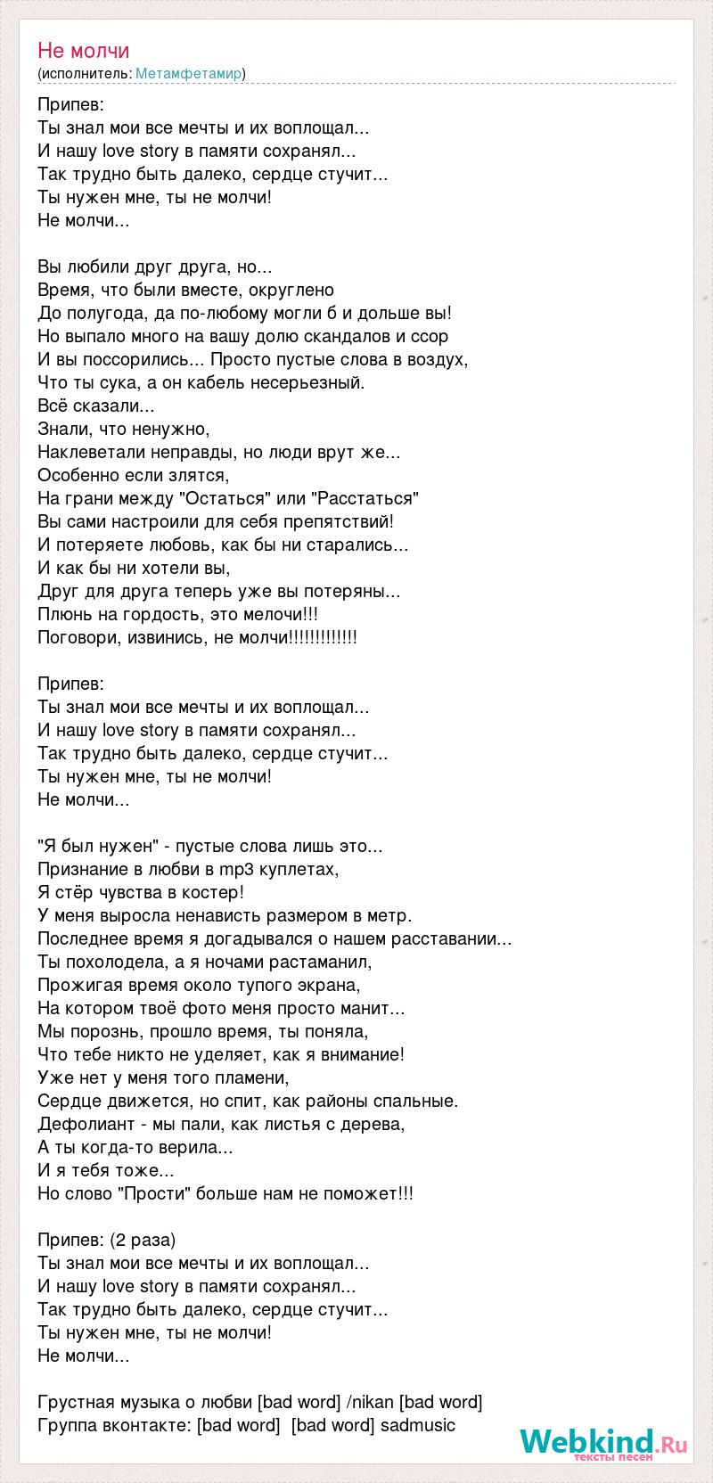 Припев: Ты знал мои все мечты и их воплощал... И нашу love story в памяти сохранял... Так трудно быть далеко, сердце стучит... Ты нужен мне, ты не молчи! Не молчи... Вы любили друг друга, но... Время, что были вместе, округлено До полугода, да по-любому могли б и дольше вы! Но выпало много на вашу долю скандалов и ссор И вы поссорились... Просто пустые слова в воздух, Что ты сука, а он кабель несерьезный. Всё сказали... Знали, что ненужно, Наклеветали неправды, но люди врут же... Особенно если злятся, На грани между "Остаться" или "Расстаться" Вы сами настроили для себя препятствий! И потеряете любовь, как бы ни старались... И как бы ни хотели вы, Друг для друга теперь уже вы потеряны... Плюнь на гордость, это мелочи!!! Поговори, извинись, не молчи!!!!!!!!!!!!! Припев: Ты знал мои все мечты и их воплощал... И нашу love story в памяти сохранял... Так трудно быть далеко, сердце стучит... Ты нужен мне, ты не молчи! Не молчи... "Я был нужен" - пустые слова лишь это... Признание в любви в mp3 куплетах, Я стёр чувства в костер! У меня выросла ненависть размером в метр. Последнее время я догадывался о нашем расставании... Ты похолодела, а я ночами растаманил, Прожигая время около тупого экрана, На котором твоё фото меня просто манит... Мы порознь, прошло время, ты поняла, Что тебе никто не уделяет, как я внимание! Уже нет у меня того пламени, Сердце движется, но спит, как районы спальные. Дефолиант - мы пали, как листья с дерева, А ты когда-то верила... И я тебя тоже... Но слово "Прости" больше нам не поможет!!! Припев: (2 раза) Ты знал мои все мечты и их воплощал... И нашу love story в памяти сохранял... Так трудно быть далеко, сердце стучит... Ты нужен мне, ты не молчи! Не молчи... Грустная музыка о любви [bad word] /nikan [bad word] Группа вконтакте: [bad word] [bad word] sadmusic