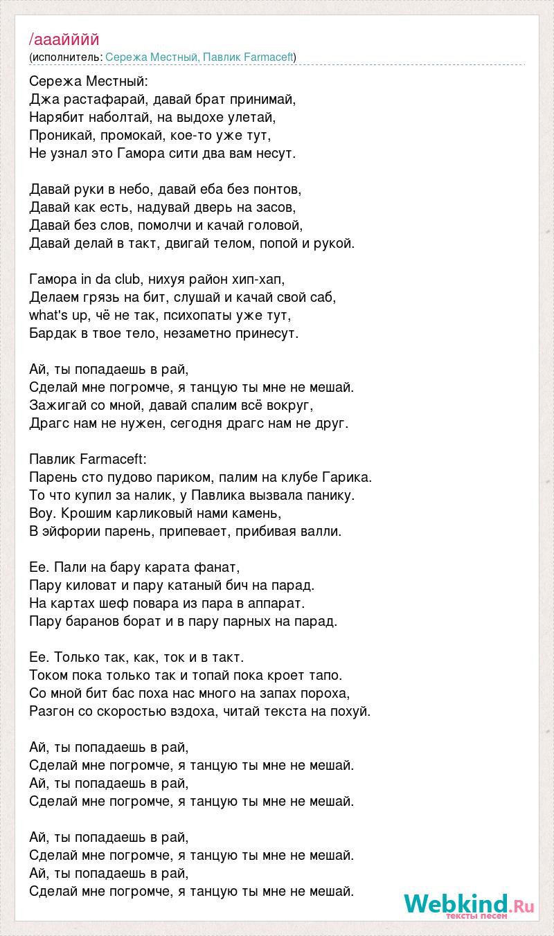 Сережа Местный: Джа растафарай, давай брат принимай, Нарябит наболтай, на выдохе улетай, Проникай, промокай, кое-то уже тут, Не узнал это Гамора сити два вам несут. Давай руки в небо, давай еба без понтов, Давай как есть, надувай дверь на засов, Давай без слов, помолчи и качай головой, Давай делай в такт, двигай телом, попой и рукой. Гамора in da club, нихуя район хип-хап, Делаем грязь на бит, слушай и качай свой саб, what's up, чё не так, психопаты уже тут, Бардак в твое тело, незаметно принесут. Ай, ты попадаешь в рай, Сделай мне погромче, я танцую ты мне не мешай. Зажигай со мной, давай спалим всё вокруг, Драгс нам не нужен, сегодня драгс нам не друг. Павлик Farmaceft: Парень сто пудово париком, палим на клубе Гарика. То что купил за налик, у Павлика вызвала панику. Воу. Крошим карликовый нами камень, В эйфории парень, припевает, прибивая валли. Ее. Пали на бару карата фанат, Пару киловат и пару катаный бич на парад. На картах шеф повара из пара в аппарат. Пару баранов борат и в пару парных на парад. Ее. Только так, как, ток и в такт. Током пока только так и топай пока кроет тапо. Со мной бит бас поха нас много на запах пороха, Разгон со скоростью вздоха, читай текста на похуй. Ай, ты попадаешь в рай, Сделай мне погромче, я танцую ты мне не мешай. Ай, ты попадаешь в рай, Сделай мне погромче, я танцую ты мне не мешай. Ай, ты попадаешь в рай, Сделай мне погромче, я танцую ты мне не мешай. Ай, ты попадаешь в рай, Сделай мне погромче, я танцую ты мне не мешай.