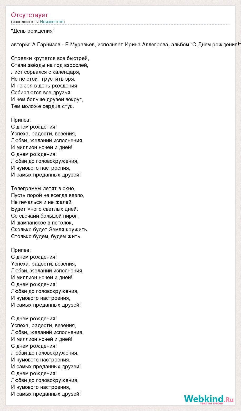 "День рождения" авторы: А.Гарнизов - Е.Муравьев, исполняет Ирина Аллегрова, альбом "С Днем рождения!" Стрелки крутятся все быстрей, Стали звёзды на год взрослей, Лист сорвался с календаря, Но не стоит грустить зря. И не зря в день рождения Собираются все друзья, И чем больше друзей вокруг, Тем моложе сердца стук. Припев: С днем рождения! Успеха, радости, везения, Любви, желаний исполнения, И миллион ночей и дней! С днем рождения! Любви до головокружения, И чумового настроения, И самых преданных друзей! Телеграммы летят в окно, Пусть порой не всегда везло, Не печалься и не жалей, Будет много светлых дней. Со свечами большой пирог, И шампанское в потолок, Сколько будет Земля кружить, Столько будем, будем жить. Припев: С днем рождения! Успеха, радости, везения, Любви, желаний исполнения, И миллион ночей и дней! С днем рождения! Любви до головокружения, И чумового настроения, И самых преданных друзей! С днем рождения! Успеха, радости, везения, Любви, желаний исполнения, И миллион ночей и дней! С днем рождения! Любви до головокружения, И чумового настроения, И самых преданных друзей! С днем рождения! Любви до головокружения, И чумового настроения, И самых преданных друзей!