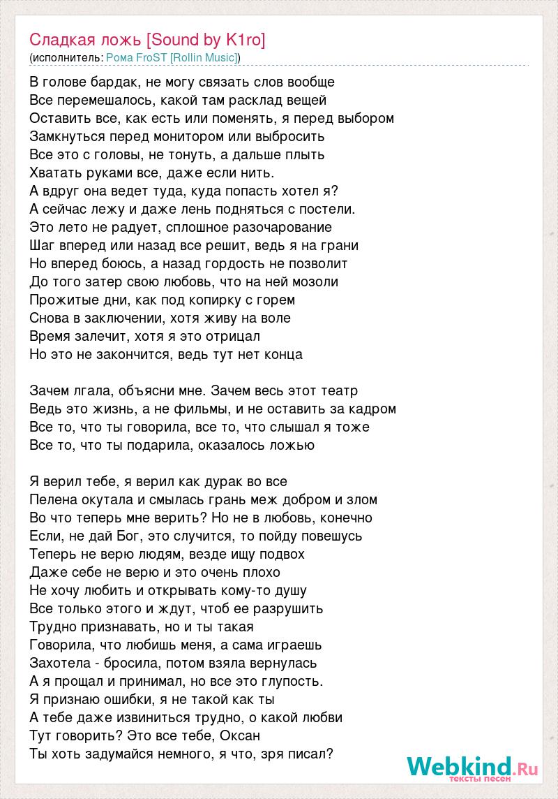 В голове бардак, не могу связать слов вообще Все перемешалось, какой там расклад вещей Оставить все, как есть или поменять, я перед выбором Замкнуться перед монитором или выбросить Все это с головы, не тонуть, а дальше плыть Хватать руками все, даже если нить. А вдруг она ведет туда, куда попасть хотел я? А сейчас лежу и даже лень подняться с постели. Это лето не радует, сплошное разочарование Шаг вперед или назад все решит, ведь я на грани Но вперед боюсь, а назад гордость не позволит До того затер свою любовь, что на ней мозоли Прожитые дни, как под копирку с горем Снова в заключении, хотя живу на воле Время залечит, хотя я это отрицал Но это не закончится, ведь тут нет конца Зачем лгала, объясни мне. Зачем весь этот театр Ведь это жизнь, а не фильмы, и не оставить за кадром Все то, что ты говорила, все то, что слышал я тоже Все то, что ты подарила, оказалось ложью Я верил тебе, я верил как дурак во все Пелена окутала и смылась грань меж добром и злом Во что теперь мне верить? Но не в любовь, конечно Если, не дай Бог, это случится, то пойду повешусь Теперь не верю людям, везде ищу подвох Даже себе не верю и это очень плохо Не хочу любить и открывать кому-то душу Все только этого и ждут, чтоб ее разрушить Трудно признавать, но и ты такая Говорила, что любишь меня, а сама играешь Захотела - бросила, потом взяла вернулась А я прощал и принимал, но все это глупость. Я признаю ошибки, я не такой как ты А тебе даже извиниться трудно, о какой любви Тут говорить? Это все тебе, Оксан Ты хоть задумайся немного, я что, зря писал?