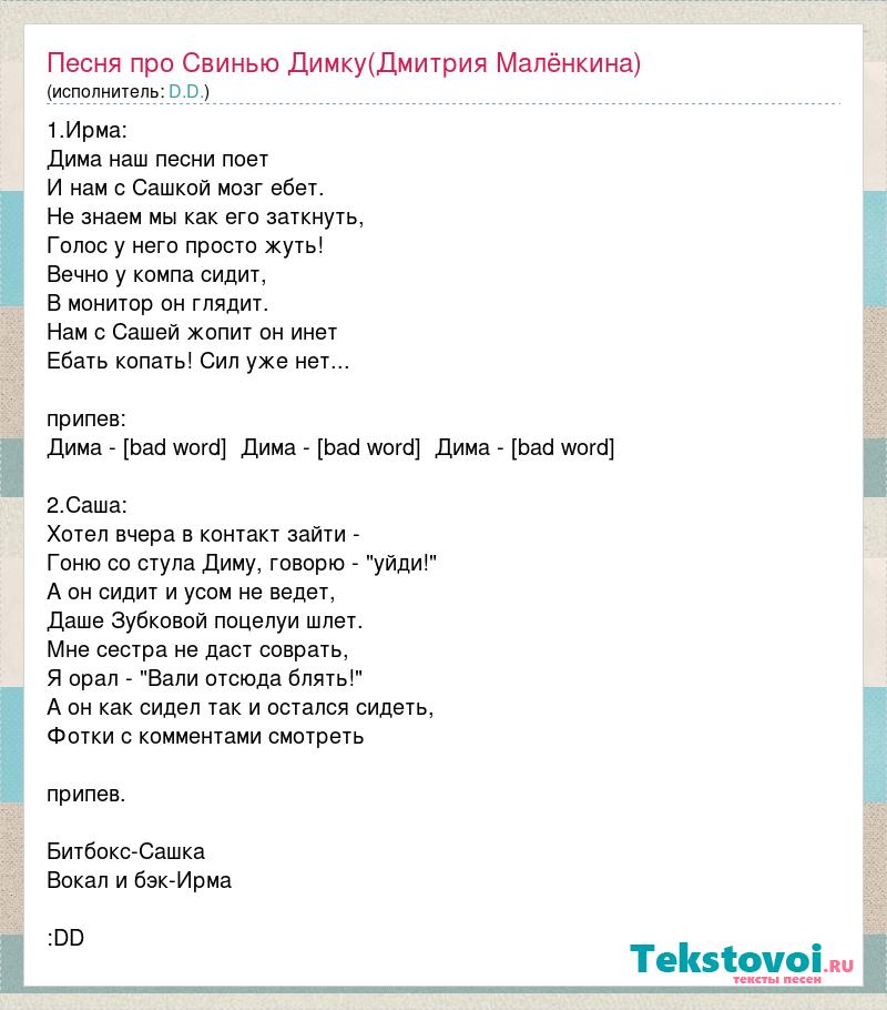 1.Ирма: Дима наш песни поет И нам с Сашкой мозг ебет. Не знаем мы как его заткнуть, Голос у него просто жуть! Вечно у компа сидит, В монитор он глядит. Нам с Сашей жопит он инет Ебать копать! Сил уже нет... припев: Дима - [bad word] Дима - [bad word] Дима - [bad word] 2.Саша: Хотел вчера в контакт зайти - Гоню со стула Диму, говорю - "уйди!" А он сидит и усом не ведет, Даше Зубковой поцелуи шлет. Мне сестра не даст соврать, Я орал - "Вали отсюда блять!" А он как сидел так и остался сидеть, Фотки с комментами смотреть припев. Битбокс-Сашка Вокал и бэк-Ирма :DD