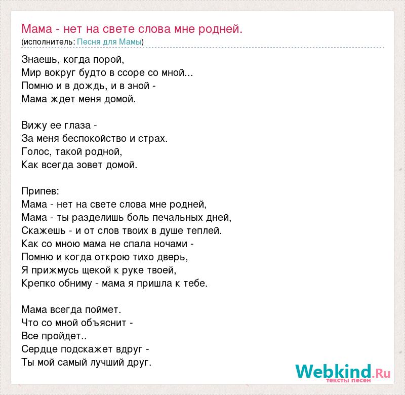 Знаешь, когда порой, Мир вокруг будто в ссоре со мной... Помню и в дождь, и в зной - Мама ждет меня домой. Вижу ее глаза - За меня беспокойство и страх. Голос, такой родной, Как всегда зовет домой. Припев: Мама - нет на свете слова мне родней, Мама - ты разделишь боль печальных дней, Скажешь - и от слов твоих в душе теплей. Как со мною мама не спала ночами - Помню и когда открою тихо дверь, Я прижмусь щекой к руке твоей, Крепко обниму - мама я пришла к тебе. Мама всегда поймет. Что со мной объяснит - Все пройдет.. Сердце подскажет вдруг - Ты мой самый лучший друг.