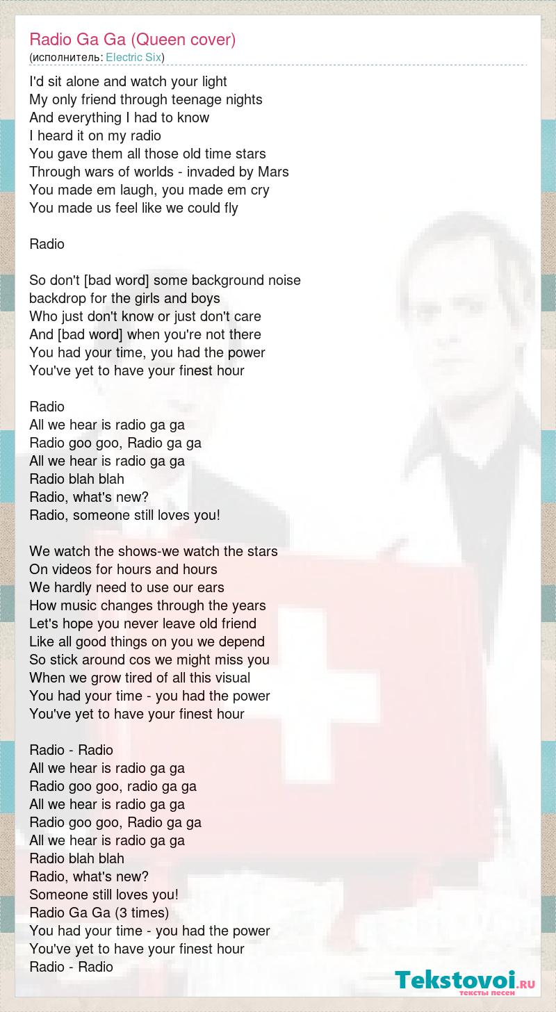 I'd sit alone and watch your light My only friend through teenage nights And everything I had to know I heard it on my radio You gave them all those old time stars Through wars of worlds - invaded by Mars You made em laugh, you made em cry You made us feel like we could fly Radio So don't become some background noise backdrop for the girls and boys Who just don't know or just don't care And just complain when you're not there You had your time, you had the power You've yet to have your finest hour Radio All we hear is radio ga ga Radio goo goo, Radio ga ga All we hear is radio ga ga Radio blah blah Radio, what's new? Radio, someone still loves you! We watch the shows-we watch the stars On videos for hours and hours We hardly need to use our ears How music changes through the years Let's hope you never leave old friend Like all good things on you we depend So stick around cos we might miss you When we grow tired of all this visual You had your time - you had the power You've yet to have your finest hour Radio - Radio All we hear is radio ga ga Radio goo goo, radio ga ga All we hear is radio ga ga Radio goo goo, Radio ga ga All we hear is radio ga ga Radio blah blah Radio, what's new? Someone still loves you! Radio Ga Ga (3 times) You had your time - you had the power You've yet to have your finest hour Radio - Radio
