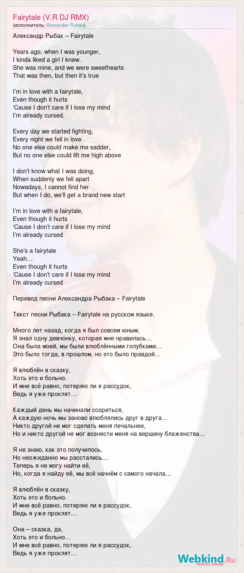 Александр Рыбак – Fairytale Years ago, when I was younger, I kinda liked a girl I knew. She was mine, and we were sweethearts That was then, but then it’s true I’m in love with a fairytale, Even though it hurts ‘Cause I don’t care if I lose my mind I’m already cursed. Every day we started fighting, Every night we fell in love No one else could make me sadder, But no one else could lift me high above I don’t know what I was doing, When suddenly we fell apart Nowadays, I cannot find her But when I do, we’ll get a brand new start I’m in love with a fairytale, Even though it hurts ‘Cause I don’t care if I lose my mind I’m already cursed She’s a fairytale Yeah… Even though it hurts ‘Cause I don’t care if I lose my mind I’m already cursed Перевод песни Александра Рыбака – Fairytale Текст песни Рыбака – Fairytale на русском языке. Много лет назад, когда я был совсем юным, Я знал одну девчонку, которая мне нравилась… Она была моей, мы были влюблёнными голубками… Это было тогда, в прошлом, но это было правдой… Я влюблён в сказку, Хоть это и больно. И мне всё равно, потеряю ли я рассудок, Ведь я уже проклят… Каждый день мы начинали ссориться, А каждую ночь мы заново влюблялись друг в друга… Никто другой не мог сделать меня печальнее, Но и никто другой не мог вознести меня на вершину блаженства… Я не знаю, как это получилось, Но неожиданно мы расстались… Теперь я не могу найти её, Но, когда я найду её, мы всё начнём с самого начала… Я влюблён в сказку, Хоть это и больно. И мне всё равно, потеряю ли я рассудок, Ведь я уже проклят… Она – сказка, да, Хоть это и больно… И мне всё равно, потеряю ли я рассудок, Ведь я уже проклят…