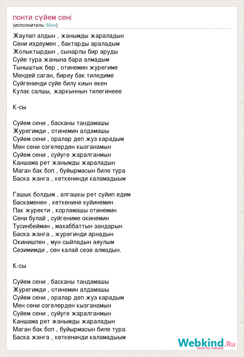 Жаулап алдын , жанымды жараладын Сени издеумен , бактарды араладым Жолыктырдын , сынарлы бир аруды Суйе тура жанына бара алмадым Тыныштык бер , отинемин журегиме Мендей саган, биреу бак тиледиме Суйгенинди суйе билу киын екен Кулак салшы, жаркыннын тилегинеее К-сы Суйем сени , басканы тандамашы Журегимди , отинемин алдамашы Суйем сени , оралар деп жуз карадым Мен сени озгелерден кызганамын Суйем сени , суйуге жаралганмын Каншама рет жанымды жараладын Маган бак боп , буйырмасын биле тура Баска жанга , кеткенинди каламадыым Гашык болдым , алгашкы рет суйип едим Баскаменен , кеткенине куйинемин Пак журекти , корламашы отинемин Сени булай , суйгениме окинемин Тусинбеймин , махаббаттын зандарын Баска жанга , журегинди арнадын Окинишпен , мун сыйладын аяулым Сезимимди , сен калай сезе алмадын. К-сы Суйем сени , басканы тандамашы Журегимди , отинемин алдамашы Суйем сени , оралар деп жуз карадым Мен сени озгелерден кызганамын Суйем сени , суйуге жаралганмын Каншама рет жанымды жараладын Маган бак боп , буйырмасын биле тура Баска жанга , кеткенинди каламадыым