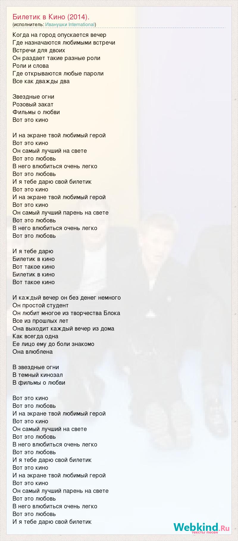 Когда на город опускается вечер Где назначаются любимыми встречи Встречи для двоих Он раздает такие разные роли Роли и слова Где открываются любые пароли Все как дважды два Звездные огни Розовый закат Фильмы о любви Вот это кино И на экране твой любимый герой Вот это кино Он самый лучший на свете Вот это любовь В него влюбиться очень легко Вот это любовь И я тебе дарю свой билетик Вот это кино И на экране твой любимый герой Вот это кино Он самый лучший парень на свете Вот это любовь В него влюбиться очень легко Вот это любовь И я тебе дарю Билетик в кино Вот такое кино Билетик в кино Вот такое кино И каждый вечер он без денег немного Он простой студент Он любит многое из творчества Блока Все из прошлых лет Она выходит каждый вечер из дома Как всегда одна Ее лицо ему до боли знакомо Она влюблена В звездные огни В темный кинозал В фильмы о любви Вот это кино Вот это любовь И на экране твой любимый герой Вот это кино Он самый лучший на свете Вот это любовь В него влюбиться очень легко Вот это любовь И я тебе дарю свой билетик Вот это кино И на экране твой любимый герой Вот это кино Он самый лучший парень на свете Вот это любовь В него влюбиться очень легко Вот это любовь И я тебе дарю свой билетик