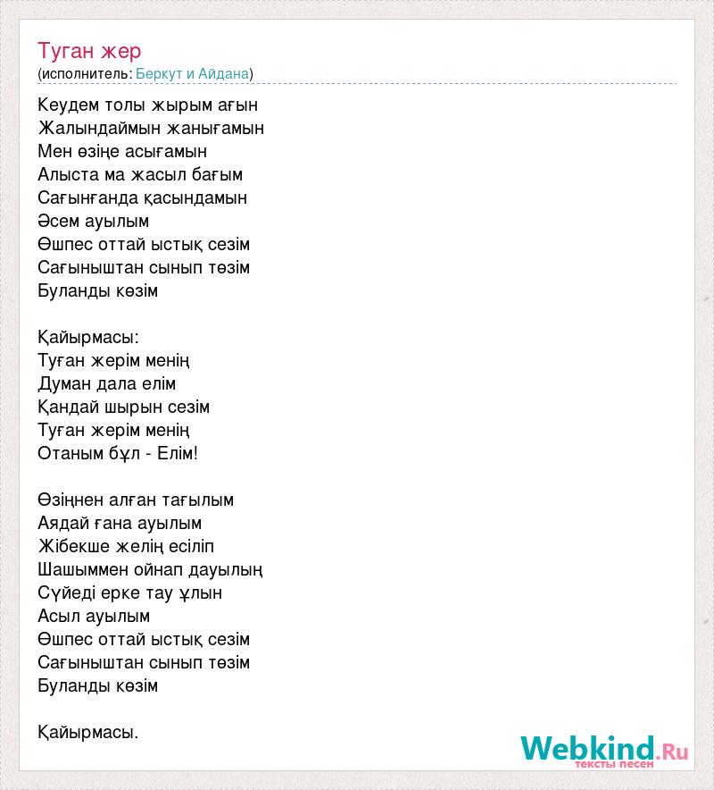 Кеудем толы жырым ағын Жалындаймын жанығамын Мен өзіңе асығамын Алыста ма жасыл бағым Сағынғанда қасындамын Әсем ауылым Өшпес оттай ыстық сезім Сағыныштан сынып төзім Буланды көзім Қайырмасы: Туған жерім менің Думан дала елім Қандай шырын сезім Туған жерім менің Отаным бұл - Елім! Өзіңнен алған тағылым Аядай ғана ауылым Жібекше желің есіліп Шашыммен ойнап дауылың Сүйеді ерке тау ұлын Асыл ауылым Өшпес оттай ыстық сезім Сағыныштан сынып төзім Буланды көзім Қайырмасы.