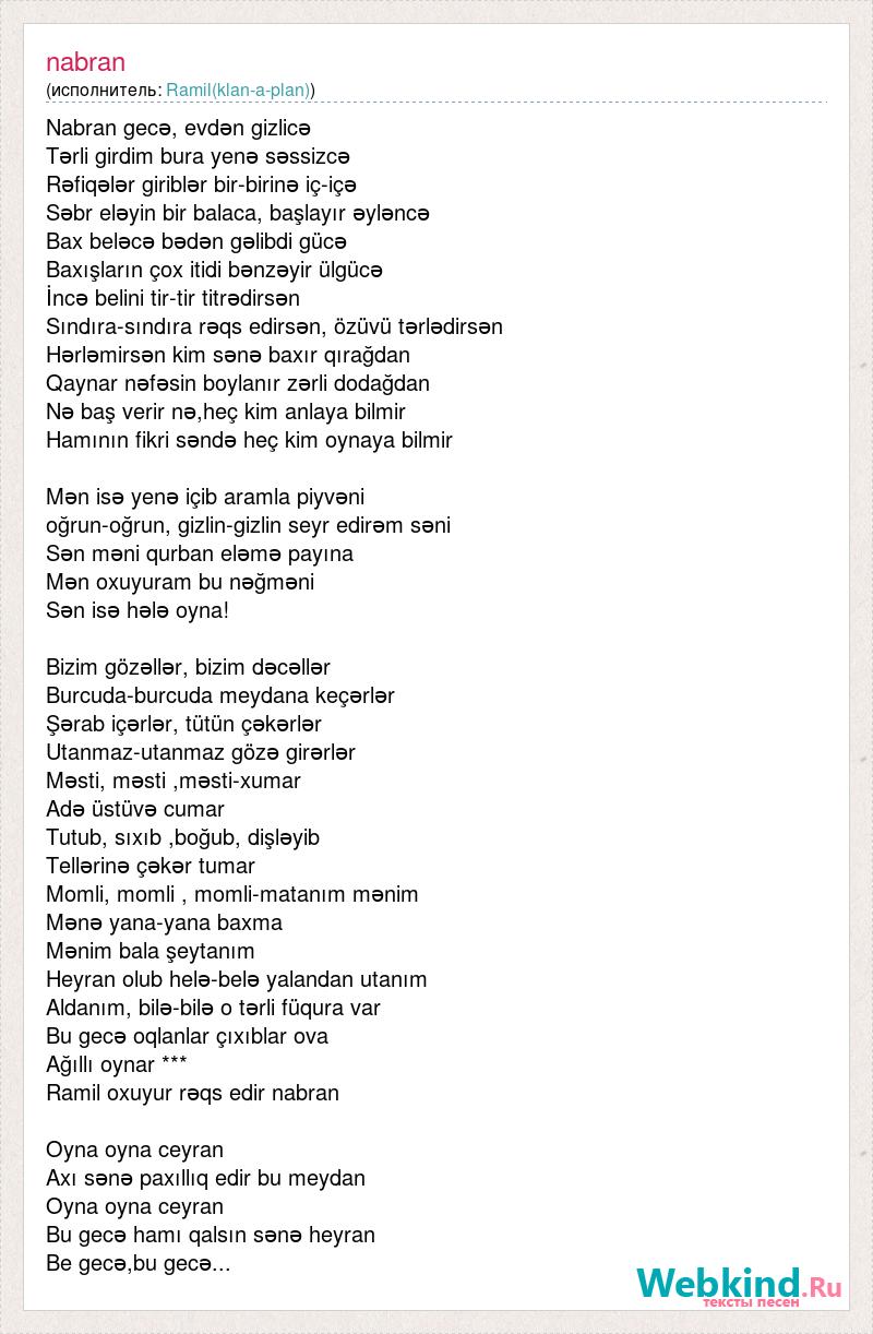 Nabran gecə, evdən gizlicə Tərli girdim bura yenə səssizcə Rəfiqələr giriblər bir-birinə iç-içə Səbr eləyin bir balaca, başlayır əyləncə Bax beləcə bədən gəlibdi gücə Baxışların çox itidi bənzəyir ülgücə İncə belini tir-tir titrədirsən Sındıra-sındıra rəqs edirsən, özüvü tərlədirsən Hərləmirsən kim sənə baxır qırağdan Qaynar nəfəsin boylanır zərli dodağdan Nə baş verir nə,heç kim anlaya bilmir Hamının fikri səndə heç kim oynaya bilmir Mən isə yenə içib aramla piyvəni oğrun-oğrun, gizlin-gizlin seyr edirəm səni Sən məni qurban eləmə payına Mən oxuyuram bu nəğməni Sən isə hələ oyna! Bizim gözəllər, bizim dəcəllər Burcuda-burcuda meydana keçərlər Şərab içərlər, tütün çəkərlər Utanmaz-utanmaz gözə girərlər Məsti, məsti ,məsti-xumar Adə üstüvə cumar Tutub, sıxıb ,boğub, dişləyib Tellərinə çəkər tumar Momli, momli , momli-matanım mənim Mənə yana-yana baxma Mənim bala şeytanım Heyran olub helə-belə yalandan utanım Aldanım, bilə-bilə o tərli füqura var Bu gecə oqlanlar çıxıblar ova Ağıllı oynar *** Ramil oxuyur rəqs edir nabran Oyna oyna ceyran Axı sənə paxıllıq edir bu meydan Oyna oyna ceyran Bu gecə hamı qalsın sənə heyran Be gecə,bu gecə...